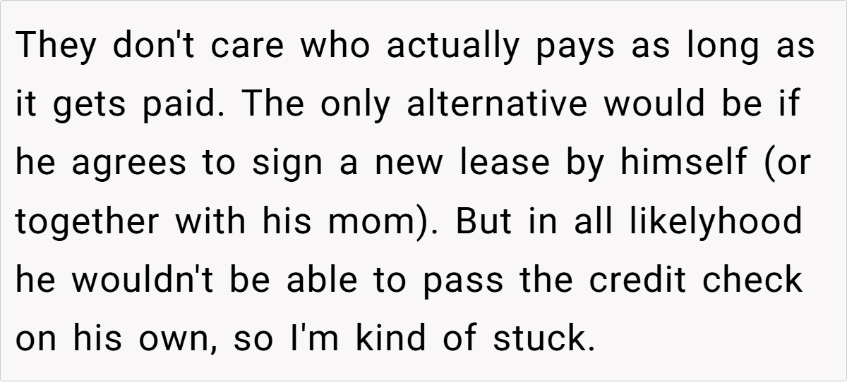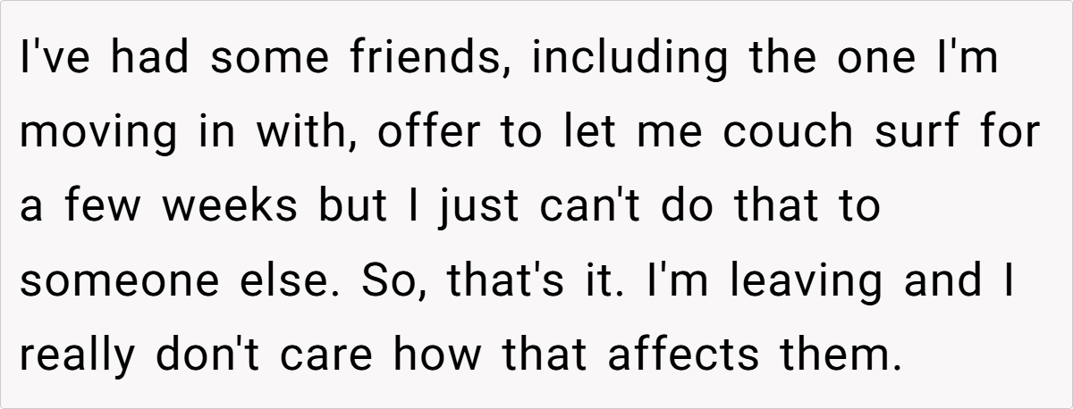 - OP Has Every Right to Leave – She isn’t responsible for ensuring her fiancé and MIL can afford the rent. If they can’t pay, that’s their problem.