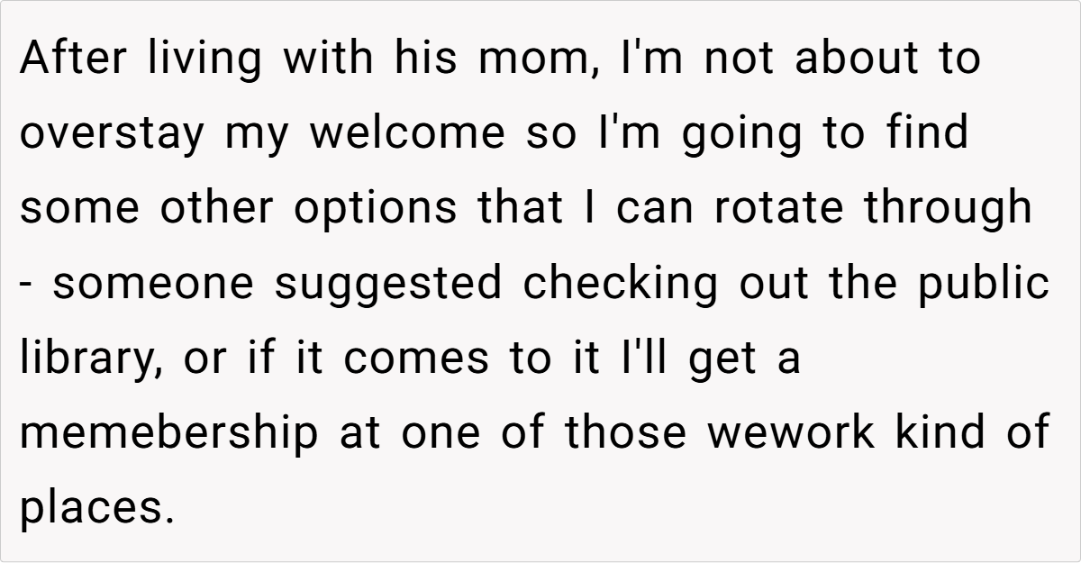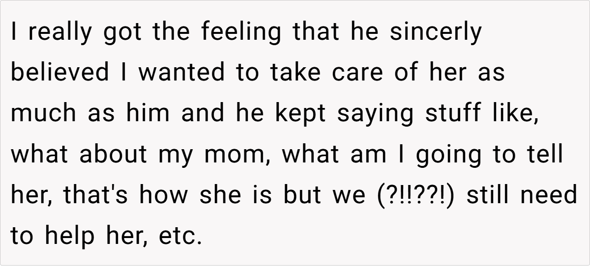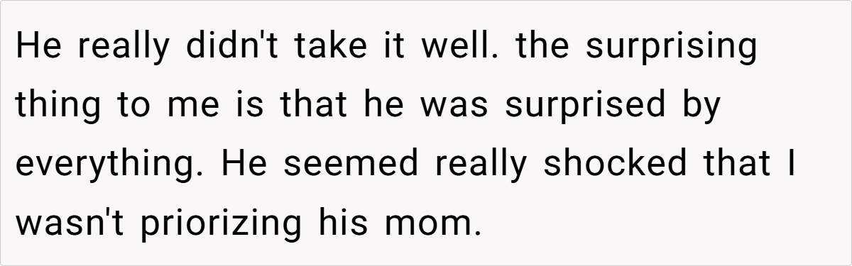 The best part? He’s shocked that she isn’t prioritizing his mother like he is. But OP has mentally and emotionally checked out—and she’s finally choosing herself.