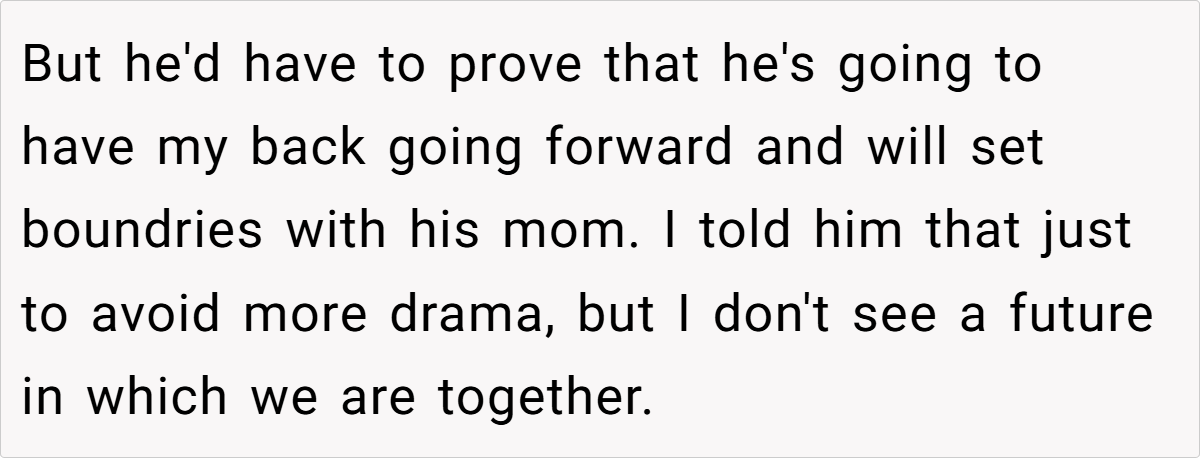 She gave him one last chance to step up—to prioritize their relationship over his mother—but instead, she got more excuses. Now, she’s done. OP is moving out, cutting her financial contributions, and leaving her fiancé and his mom to fend for themselves.