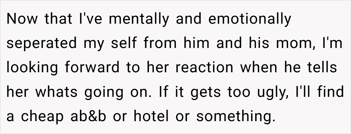 - This Would Have Been OP’s Life Forever – If OP had stayed, MIL would never leave. She would have dictated everything—household decisions, finances, even how OP raised her future kids.