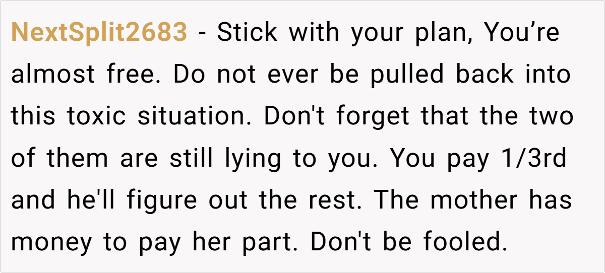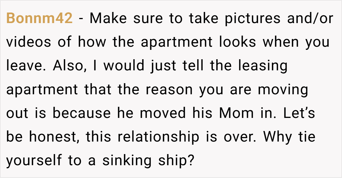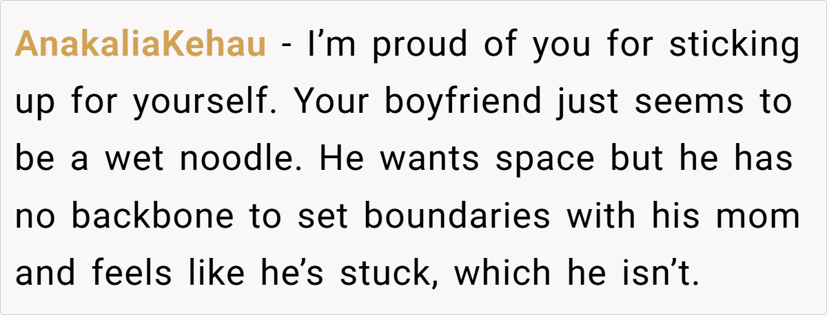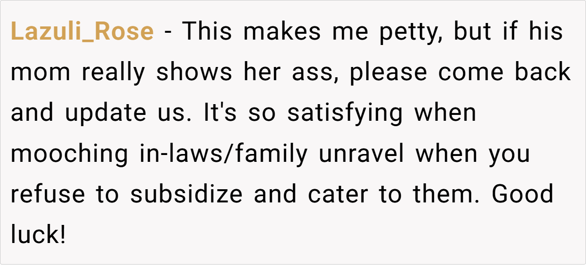 Most users applauded OP for choosing herself. Many pointed out that her fiancé is a “wet noodle” with no backbone and will never put her first. Some emphasized how MIL planned this from the start—she never applied for jobs, meaning she intended to mooch off OP the entire time.