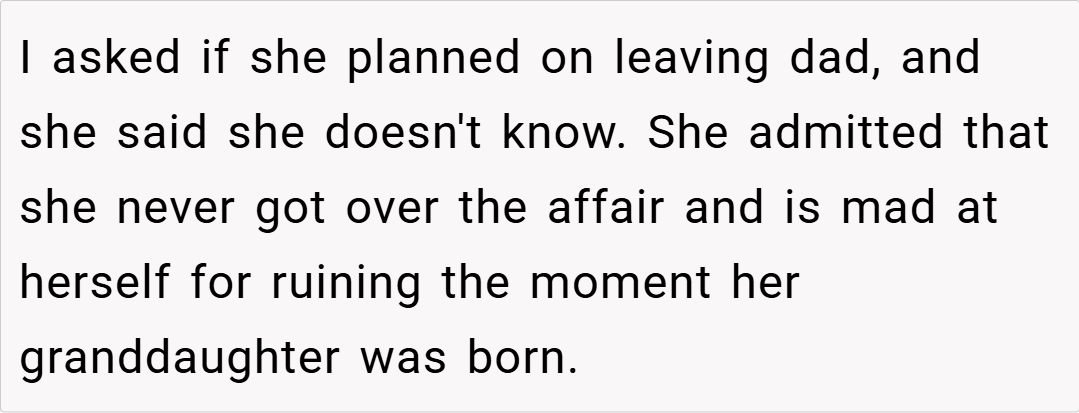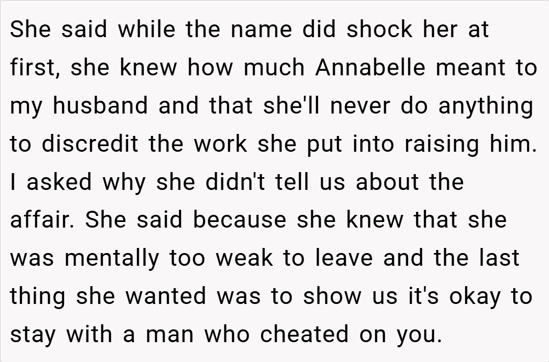Honesty, although difficult, paves the way for forgiveness and growth.” In this case, the mother’s emotional outpouring—explaining that she was too weak to leave and fearing that staying would send a message of tolerance toward cheating—revealed a vulnerability that, once shared, helped diffuse the tension.
