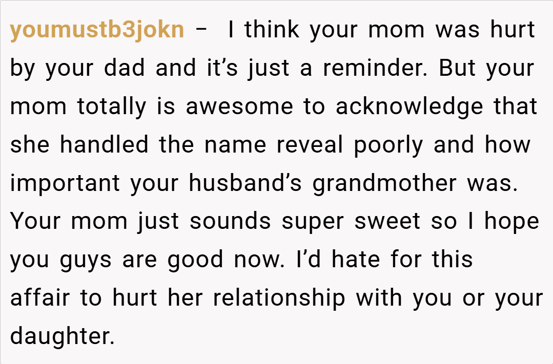 Several redditors expressed relief and support for the family’s progress, with one user writing, “It’s so refreshing to see a family finally come together to address the hurt from years ago. Names can carry painful meanings, but they can also honor legacies if we’re willing to talk about it.”