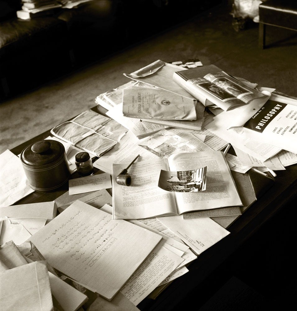 There, he captured haunting images of Einstein’s desk, cluttered with papers, books, and his pipe, all centered around an empty chair and a blackboard filled with equations.