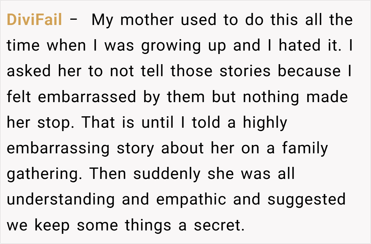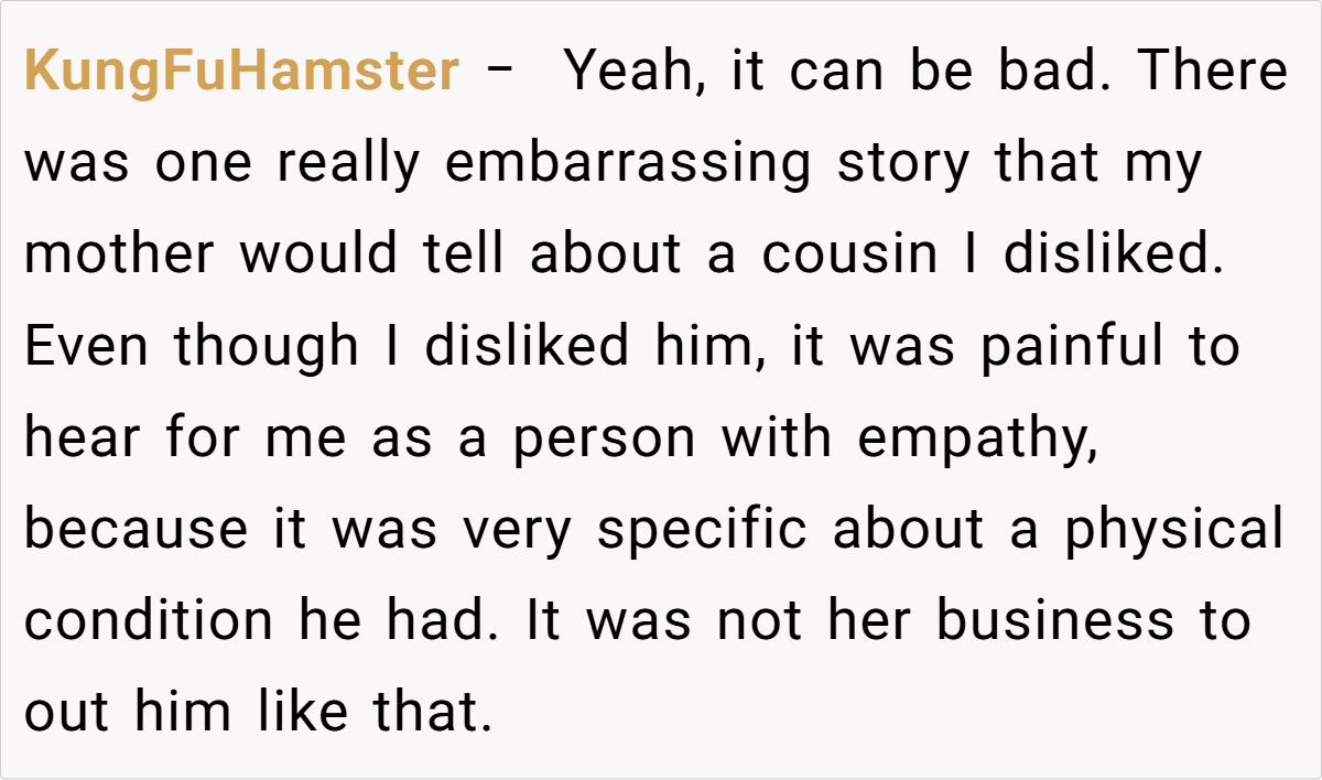 These are popular opinions on Reddit, but do they really reflect the full complexity of family dynamics? The varied responses show that while some find solace in humor, others view these recurring stories as a breach of trust. The discussion invites us to consider: is it possible to laugh together without leaving someone feeling small?