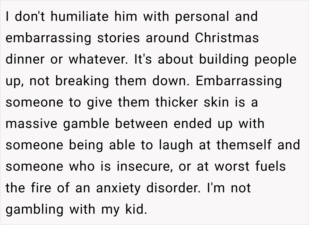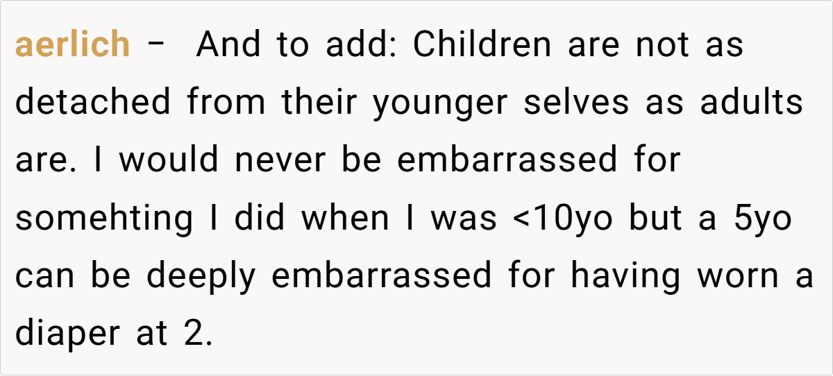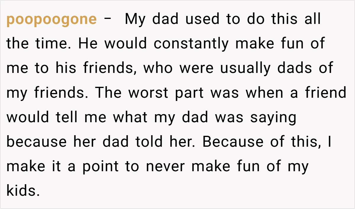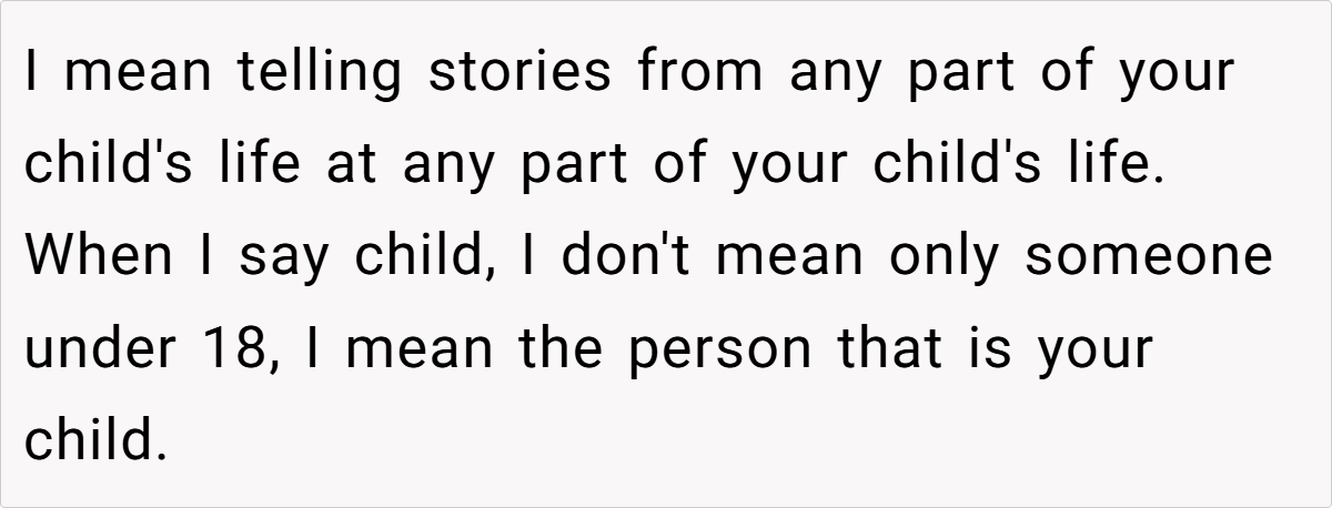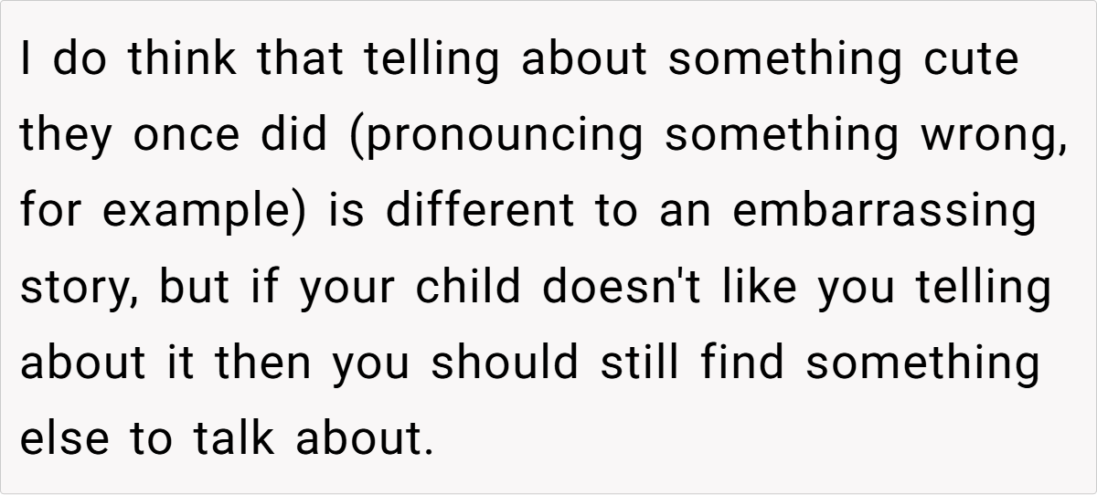Sometimes, a family story isn’t just a funny memory—it’s a window into deeper dynamics. Letting these personal moments become punchlines can inadvertently chip away at a child’s self-esteem. The post reminds us that while laughter is an important part of family life, it should never come at the cost of someone’s dignity. Parents walk a fine line between playful banter and emotional harm, and it’s a balance that requires constant care and sensitivity.