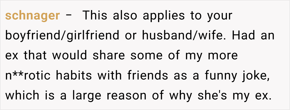 Expanding the discussion further, this phenomenon touches on broader societal norms about humor and respect. In many cultures, using personal anecdotes to bond is common, yet the risk of crossing into humiliation is high. Consider the case of celebrity relationships where personal stories sometimes make headlines—think of how actor Ryan Reynolds has humorously recounted personal mishaps, but always with the consent and mutual respect of his partner. The public nature of these retellings can sometimes blur the line between shared amusement and public shaming, urging us to be more mindful about our private histories.