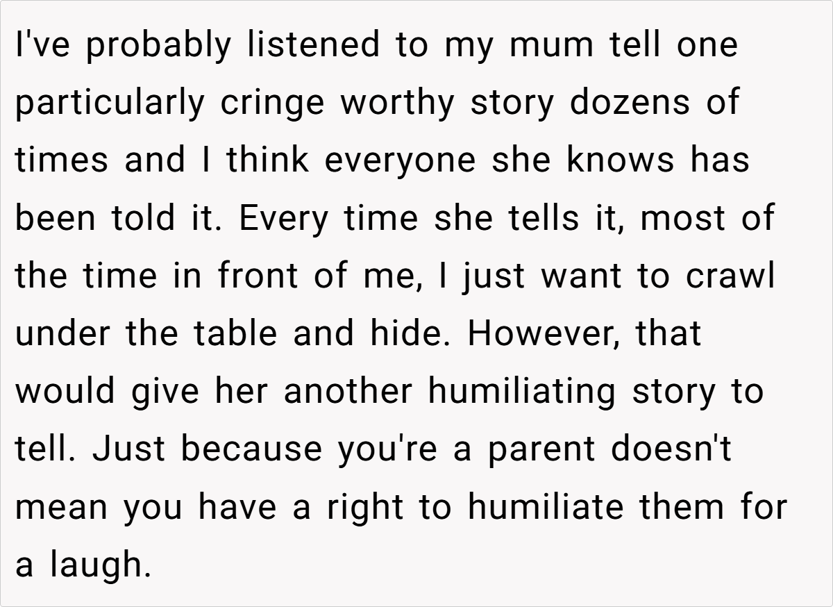 There’s nothing quite like that heart-sinking moment when a cherished family dinner turns into an unintended roast of your childhood. In this compelling Reddit post, a user recounts the all-too-common scenario of a well-meaning parent repeatedly sharing embarrassing childhood stories at every gathering.