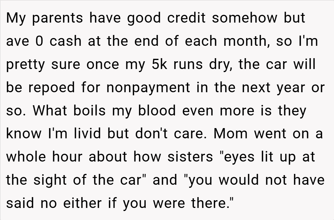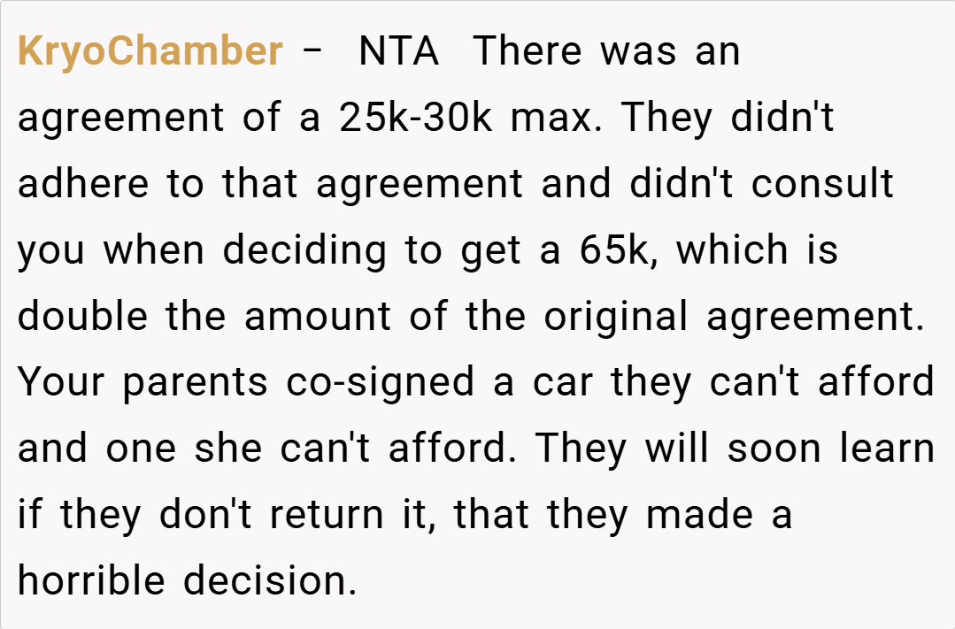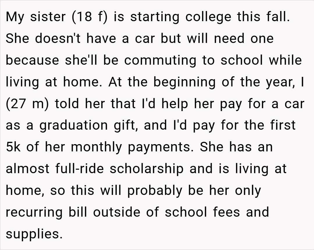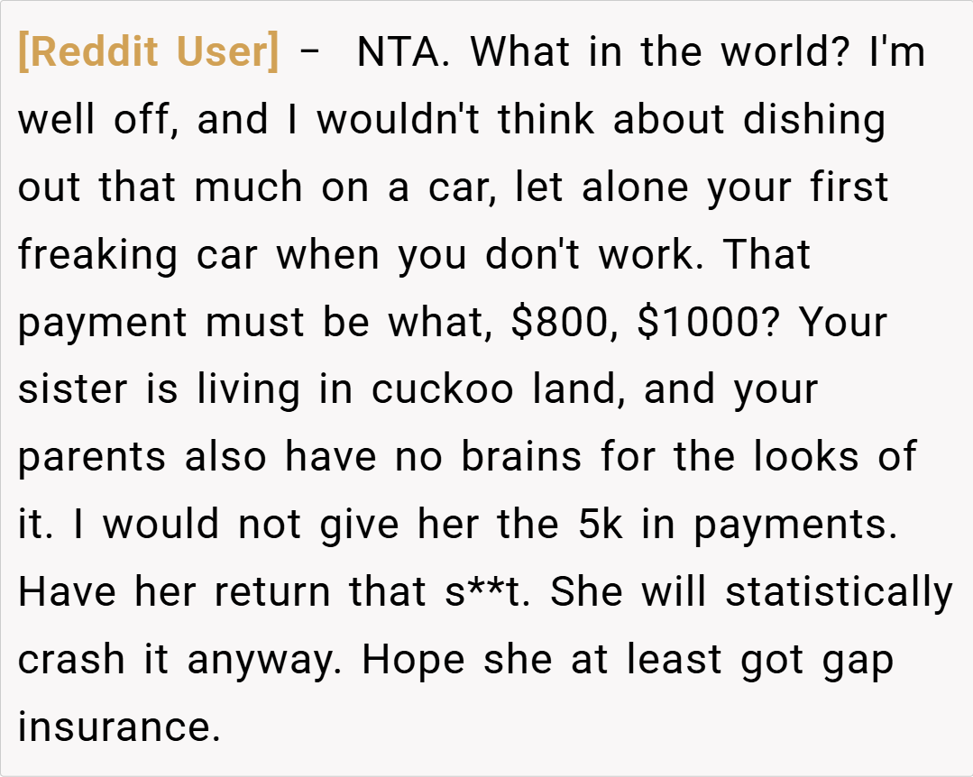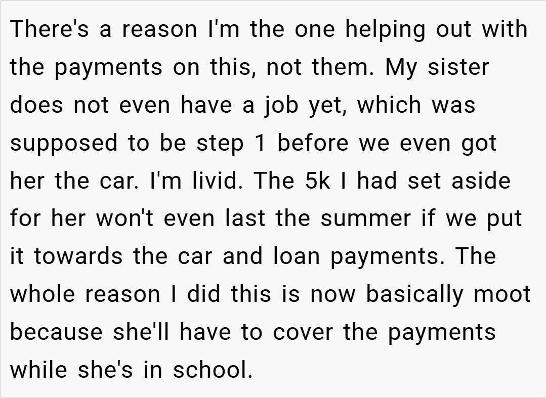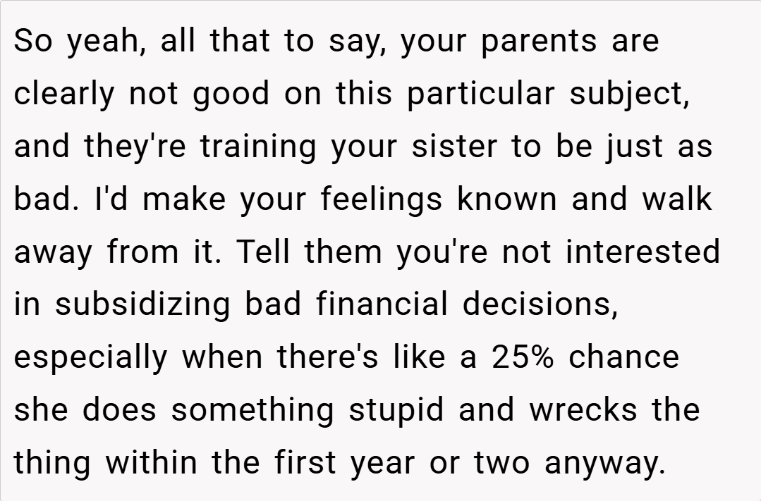has not only upset the balance of trust but also jeopardized the sister’s financial stability. This decision appears to be more about flash than practicality, risking long-term consequences for someone with no income yet. Deciding to step back from an agreement that no longer reflects realistic financial boundaries is a difficult choice. It highlights the importance of accountability in family financial arrangements.