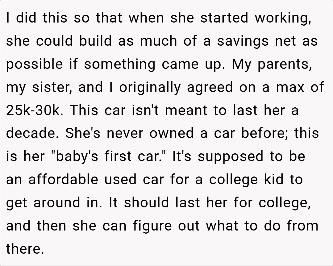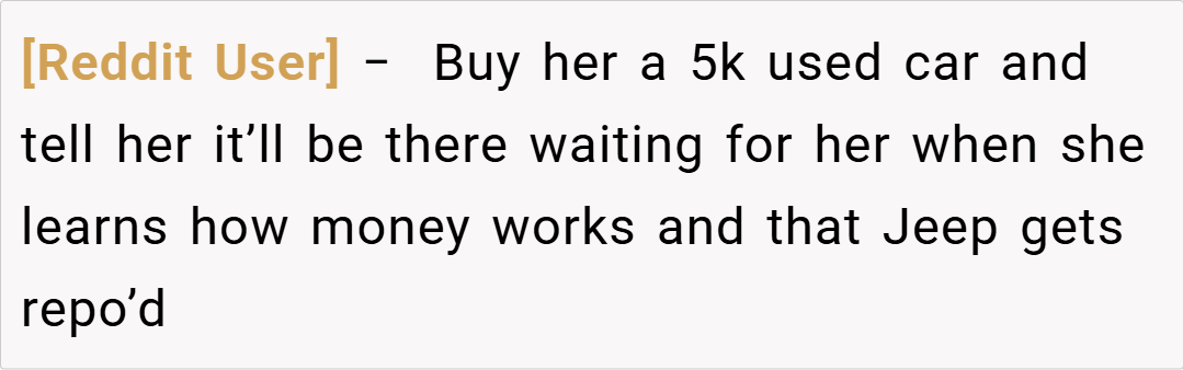 The plan was simple: a modest car within a $25k–$30k range and a commitment to cover the first $5k of monthly payments—a graduation gift to set her on a path of financial independence. However, the journey took an unforeseen detour when his sister and their parents bypassed the original agreement and opted for a flashy, brand‑new Jeep priced at a staggering $65k.