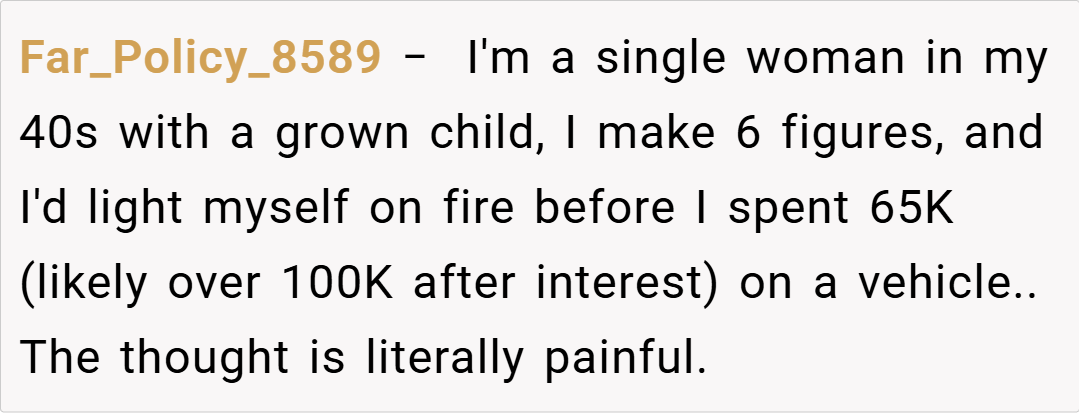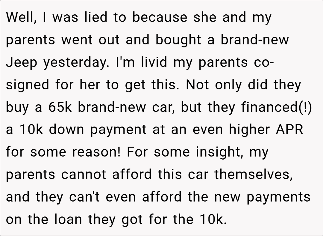 Family financial disputes can quickly escalate when promises made in trust are shattered by impulsive decisions. In this case, what began as a supportive gift quickly morphed into a financial quagmire. The initial plan was clearly laid out—a cost-effective car for a college student to rely on without sinking into debt. However, the sudden purchase of a $65k Jeep, financed at a high APR with a down payment far exceeding the agreed budget,