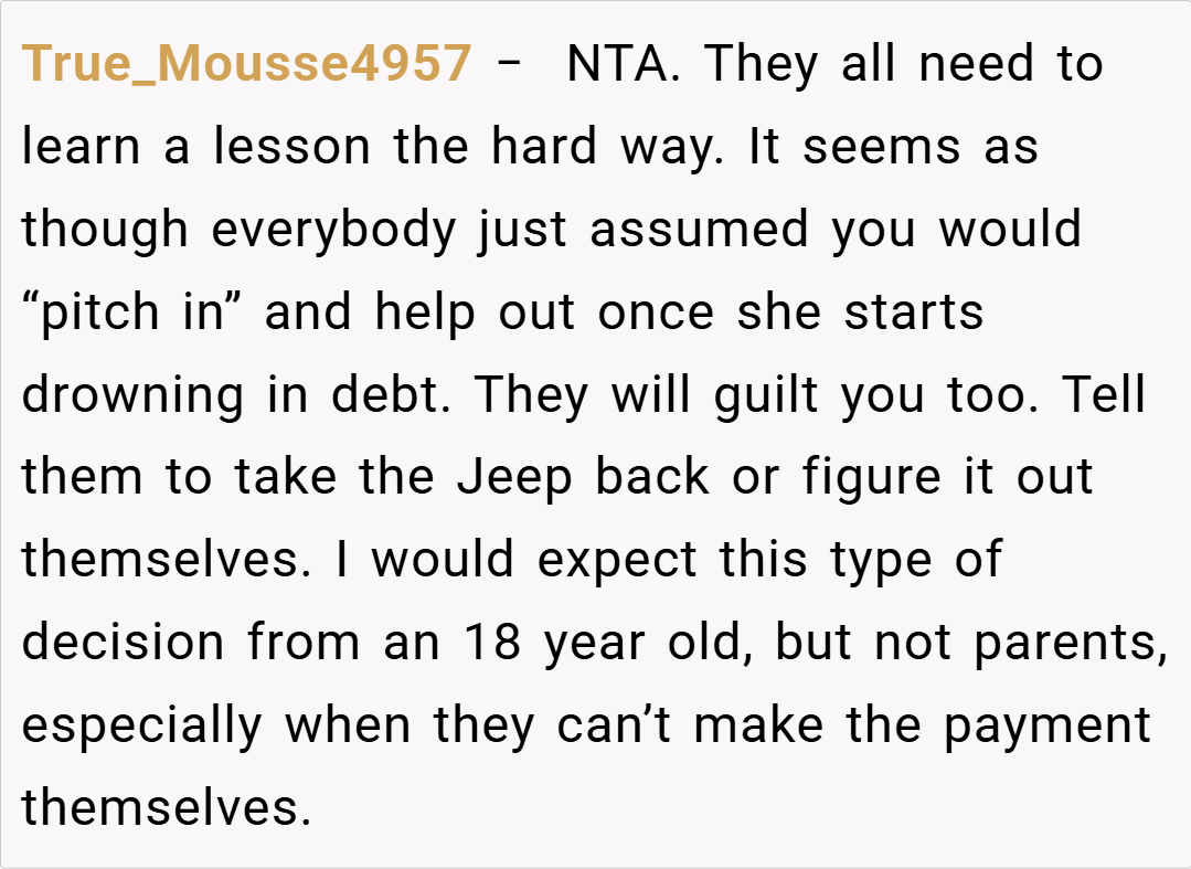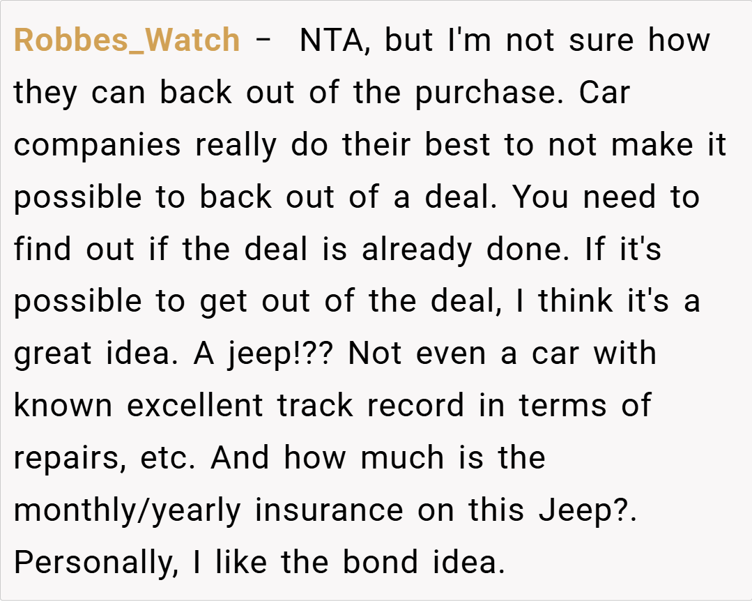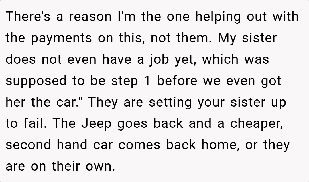 ‘WIBTA if I back out of helping my sister pay for a car because she went and got a 65k jeep instead of what we originally agreed on?’