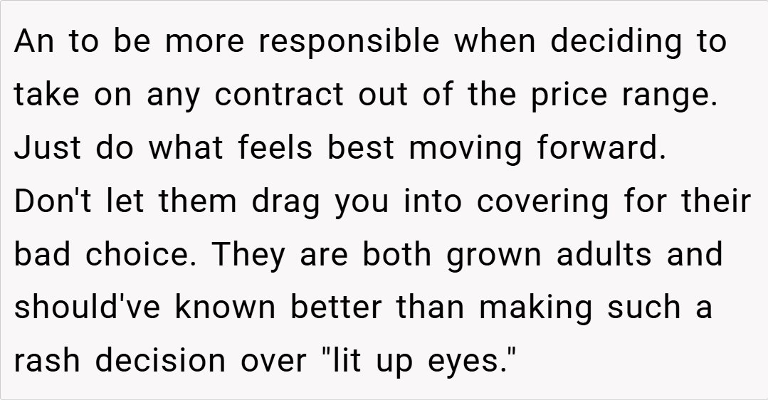 Redditors overwhelmingly agree that backing out is the right call. They criticize the parents for setting up a financially doomed situation and commend the brother for standing up against impractical spending. The consensus is clear: if your family can’t stick to the plan, you’re under no obligation to pick up the tab for a financial trainwreck.