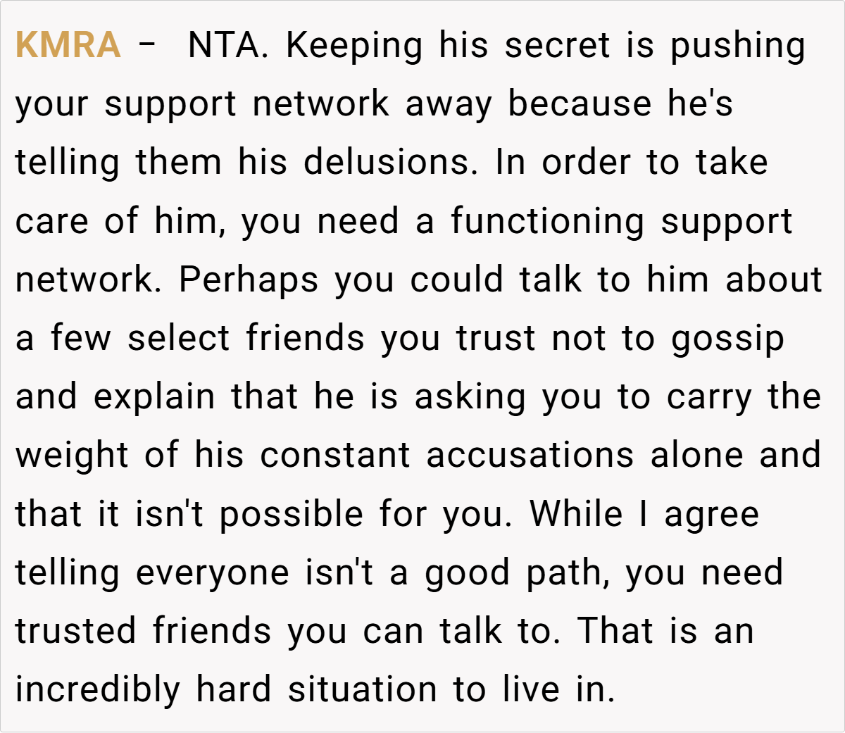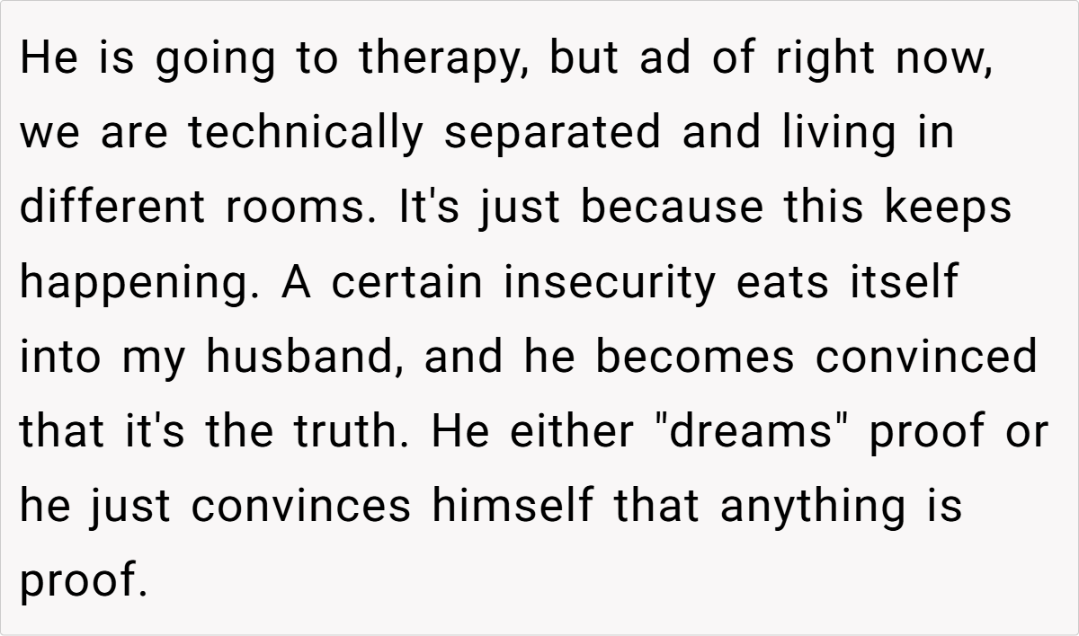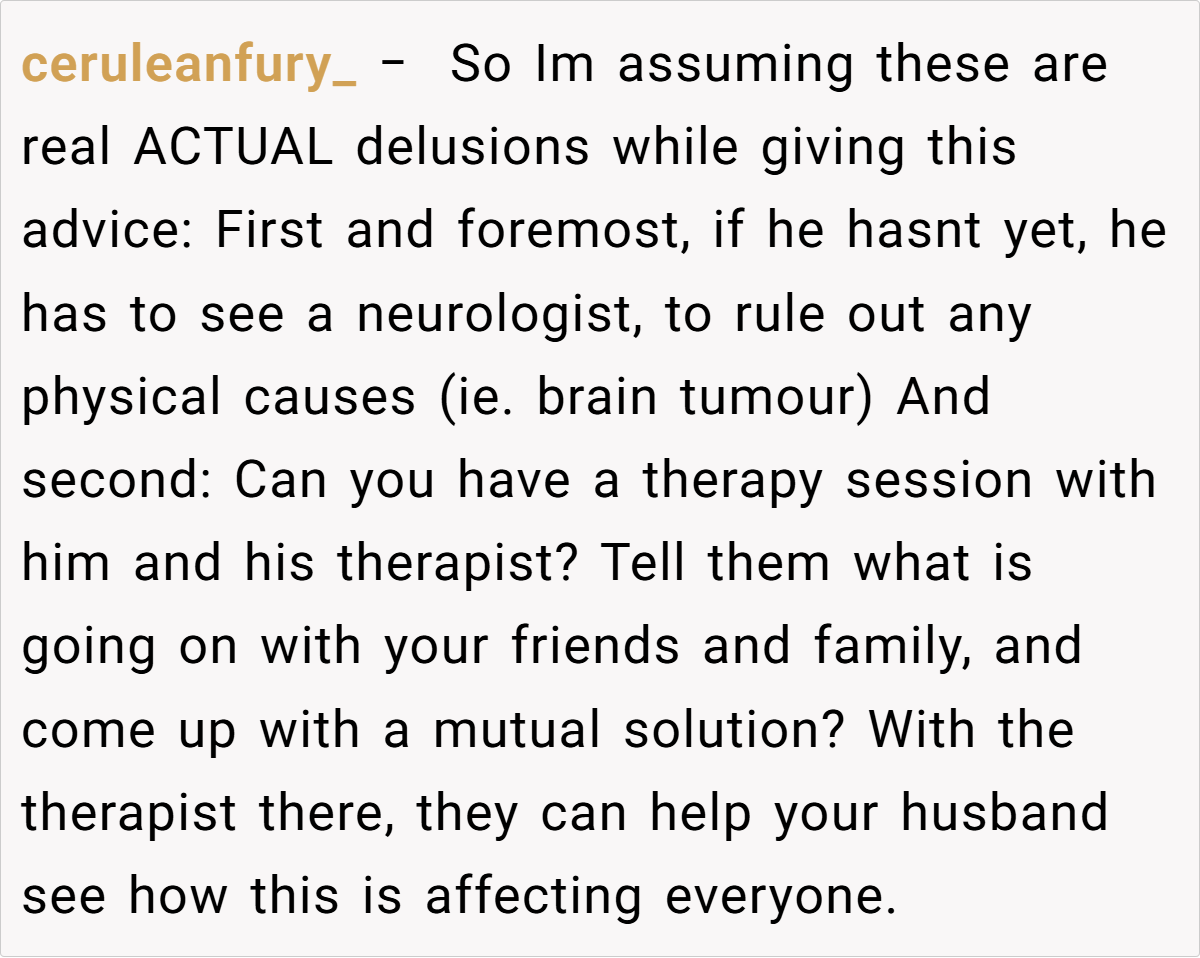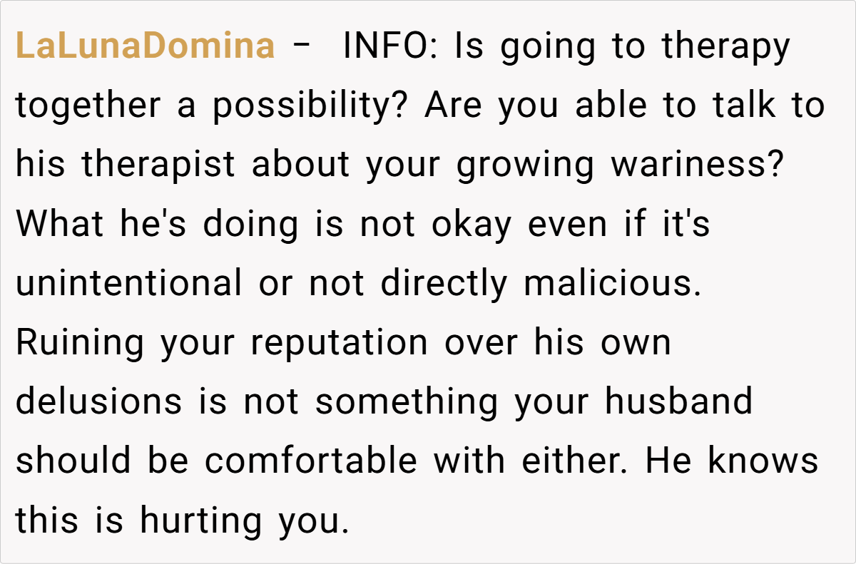 Analyzing the situation, it’s clear that the husband’s recurring episodes—where he fabricates evidence of infidelity—are not merely random misinterpretations but signs of deeper psychological issues. His therapy may be addressing these delusions, yet the consistent pattern of mistrust is taking its toll on their family dynamic. The impact on mutual friends and even their daughter underscores a cascading effect of these misdirected beliefs, leaving the woman feeling increasingly isolated and overwhelmed by responsibility.