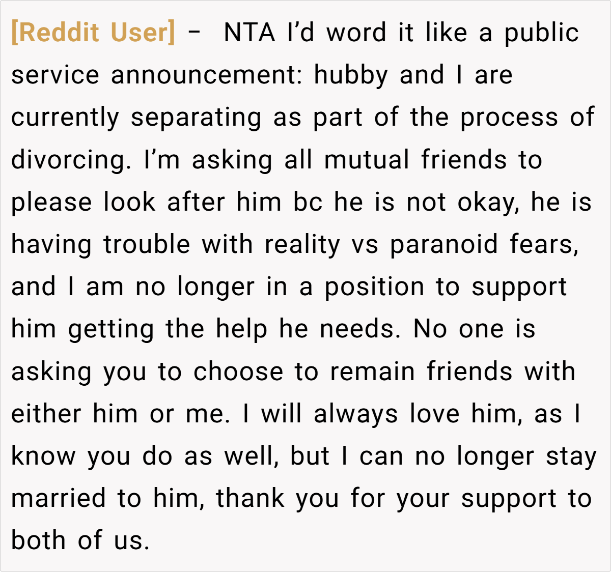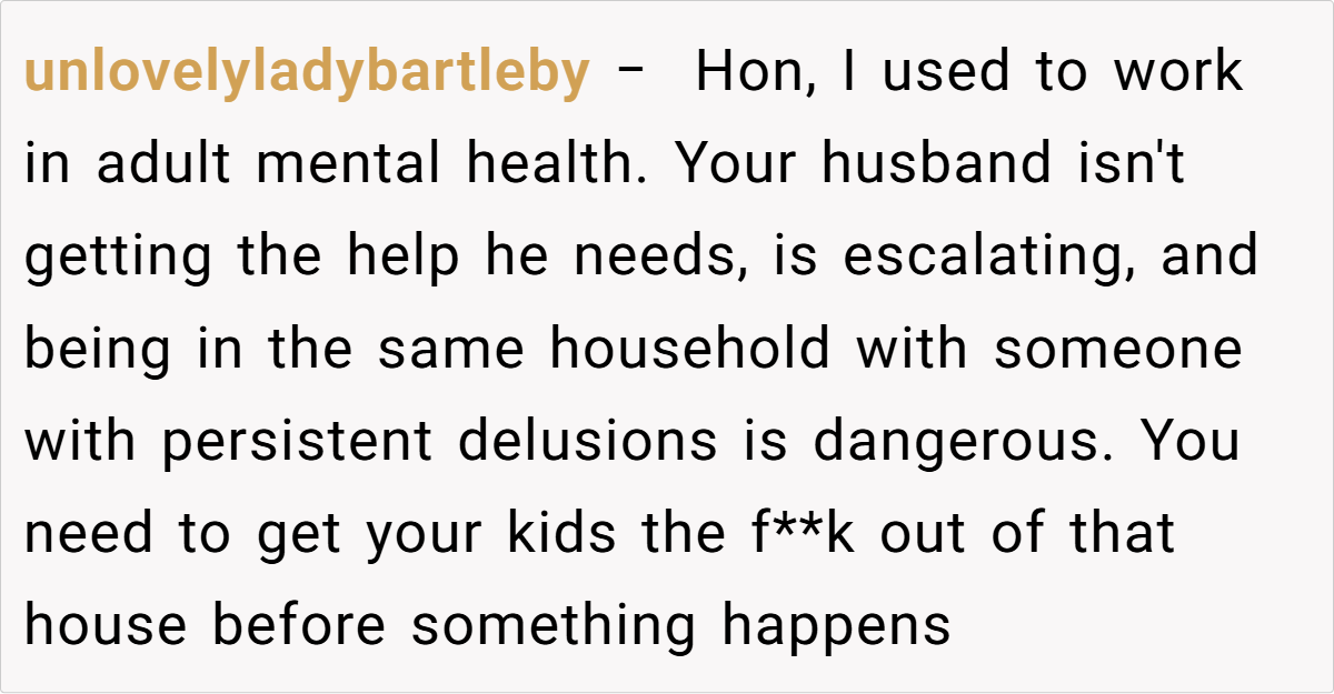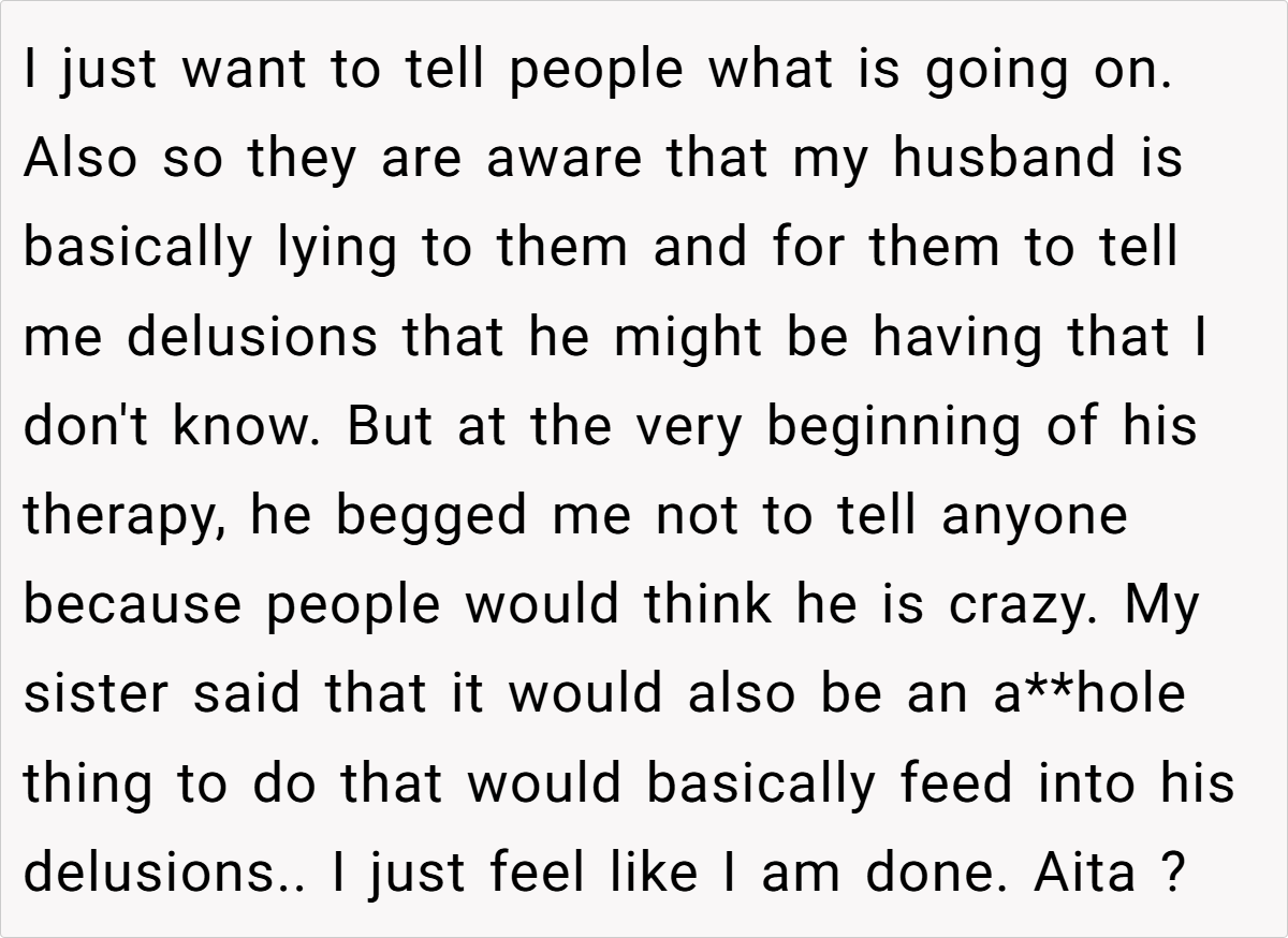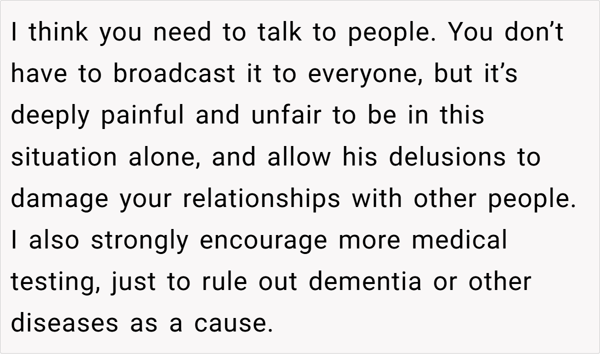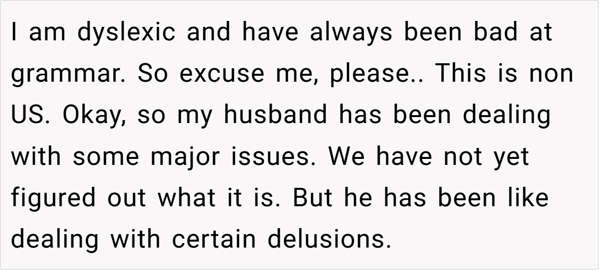 In the midst of everyday life, some relationships face challenges that are as baffling as they are heartbreaking. One woman shares her story of navigating a painful, slowly crumbling trust as her husband’s persistent delusions begin to estrange not only him but also the support network they once shared. The vivid account immediately draws you into a world where love, betrayal, and mental health issues intertwine, leaving readers to wonder how far one can go before the weight of doubt becomes unbearable.