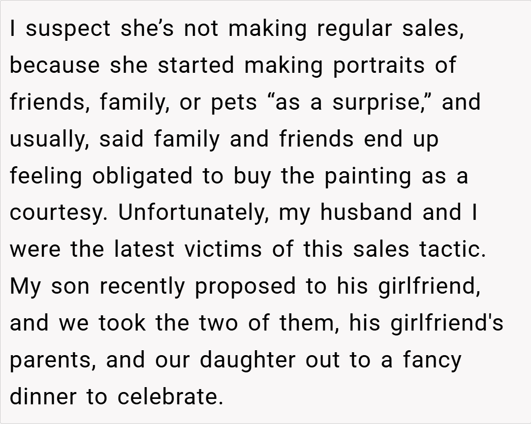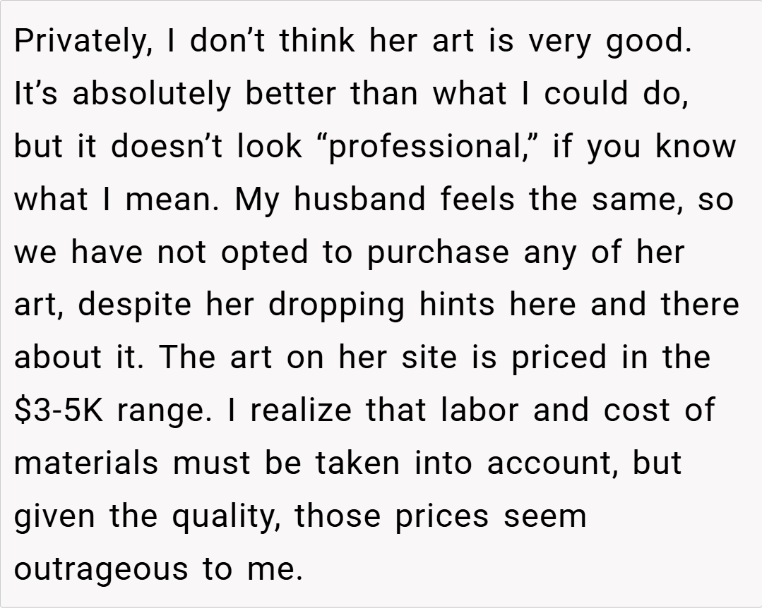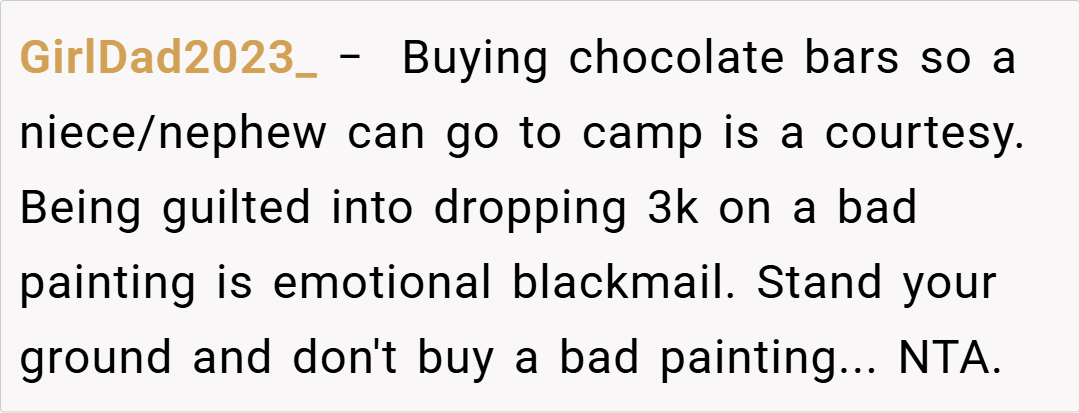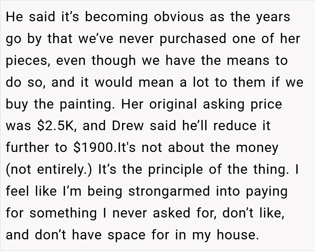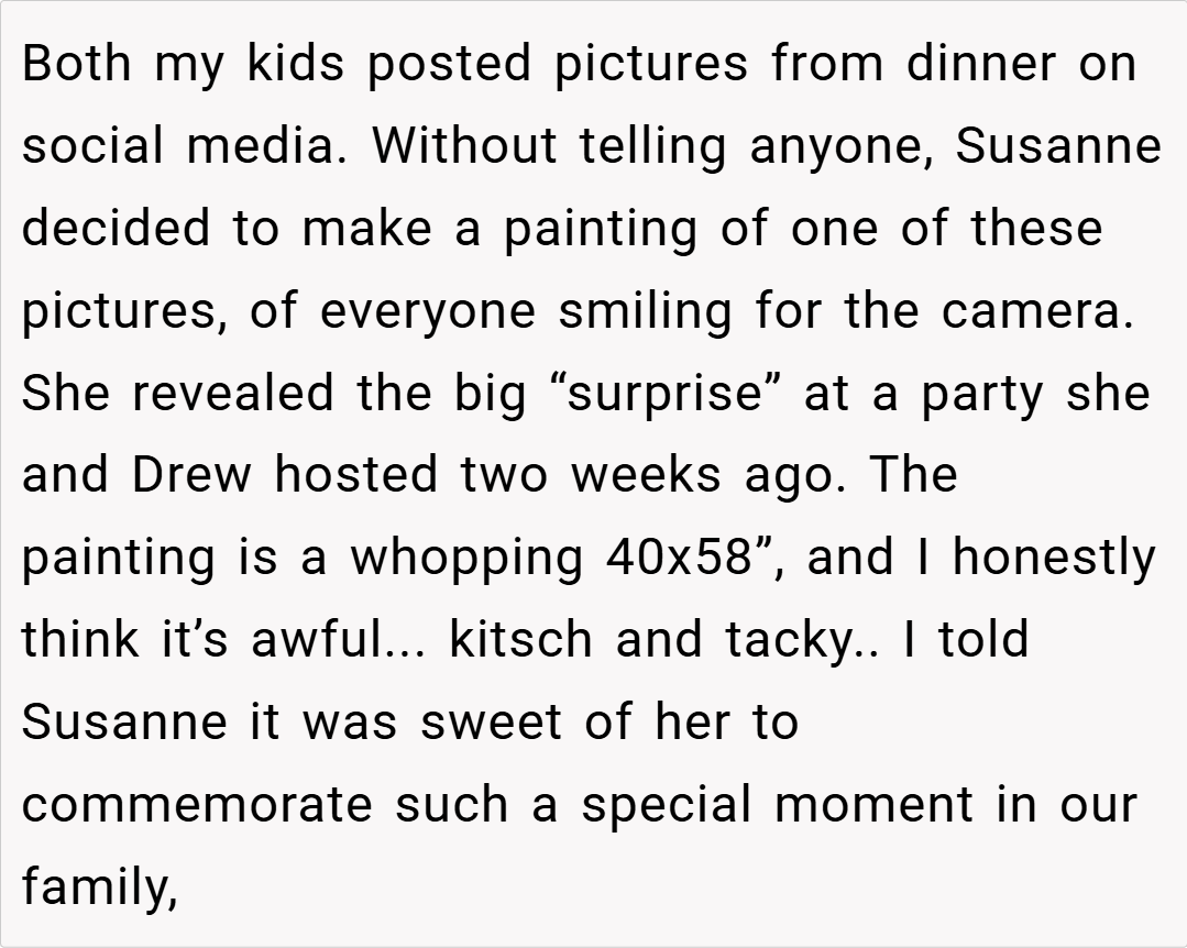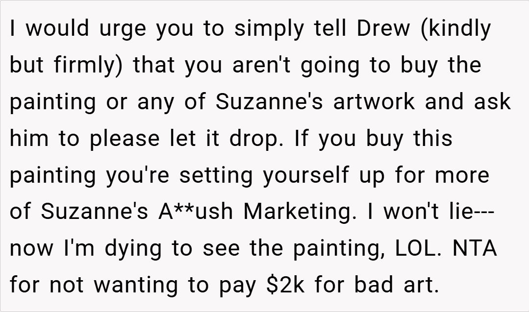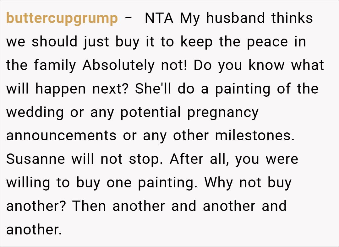 “It’s common for step-relatives and in-laws to feel pressured to conform to a collective family image, but individuality is equally important. When an artwork doesn’t resonate with the buyer, forcing it into the household can lead to ongoing tension and resentment.” In this case, the mom’s refusal to buy the painting isn’t a rejection of Susanne’s passion or talent; it’s an assertion of her right to curate her own space without being guilt-tripped into a purchase she finds disagreeable.