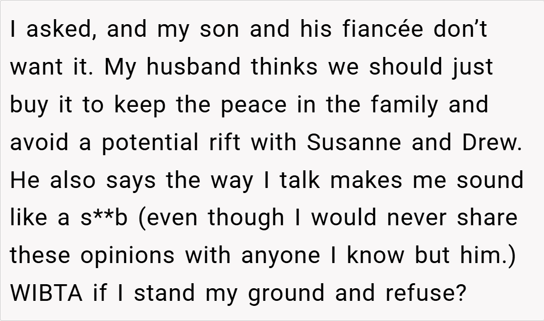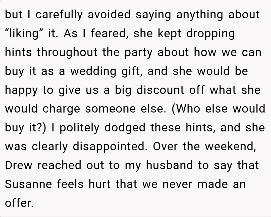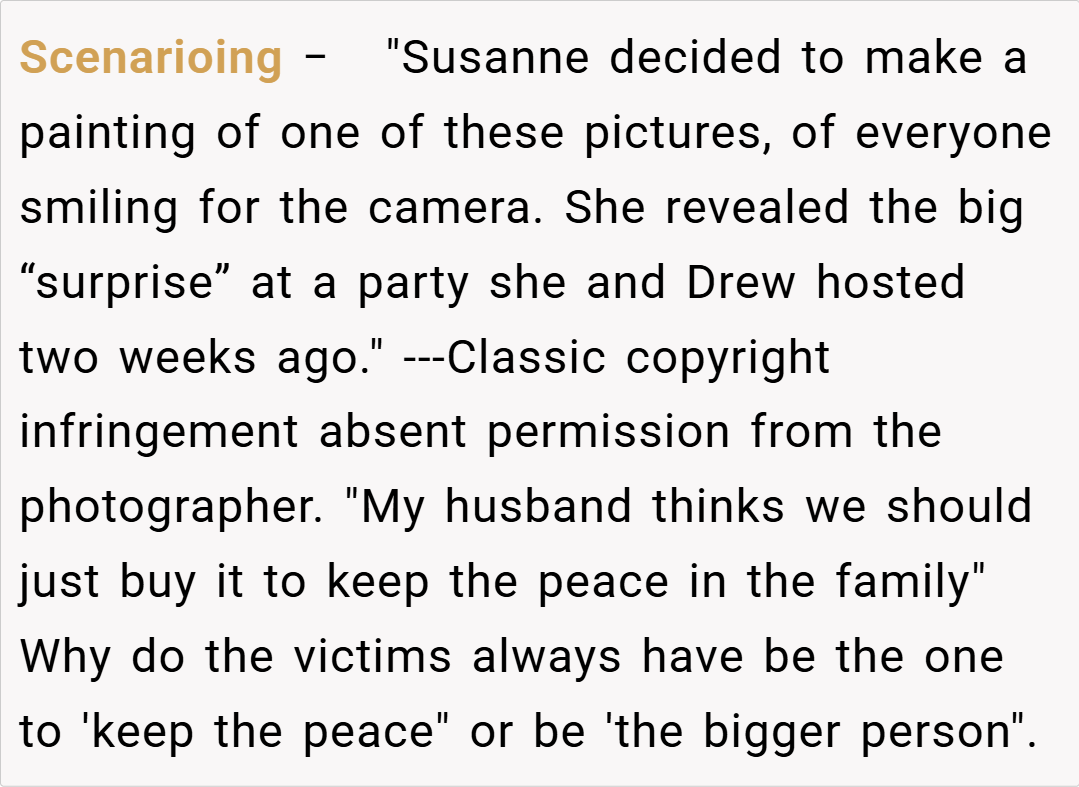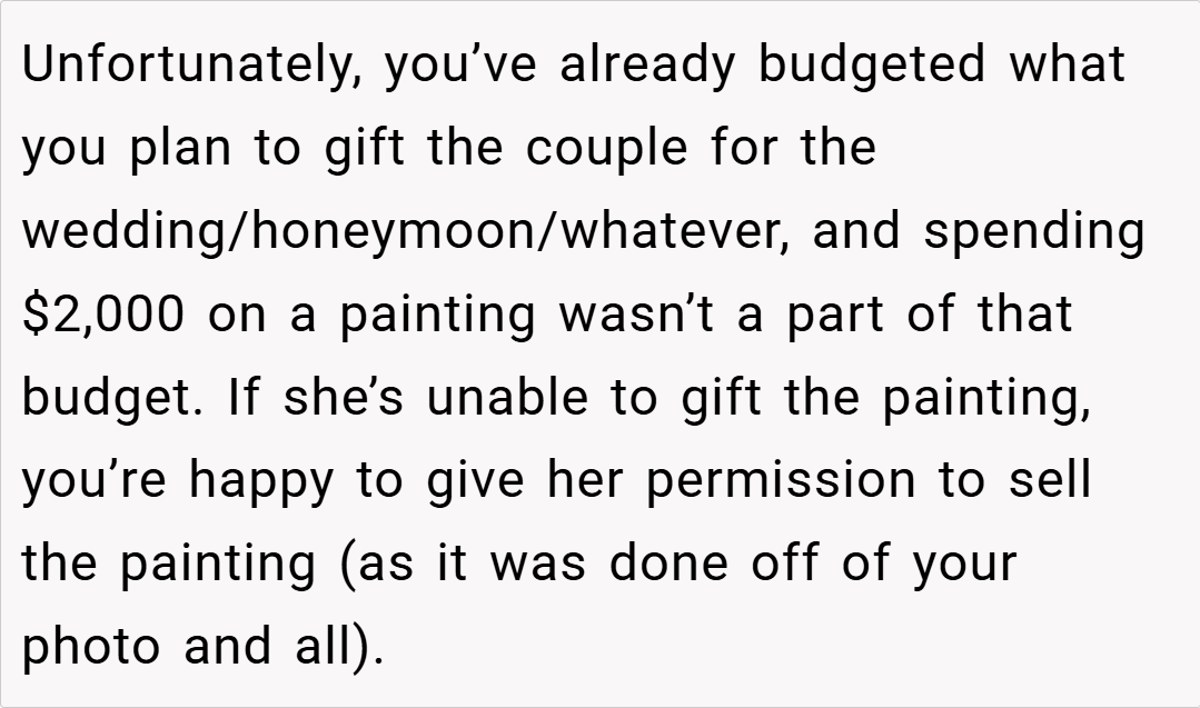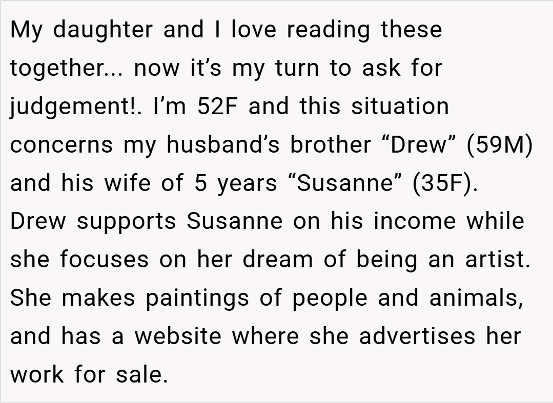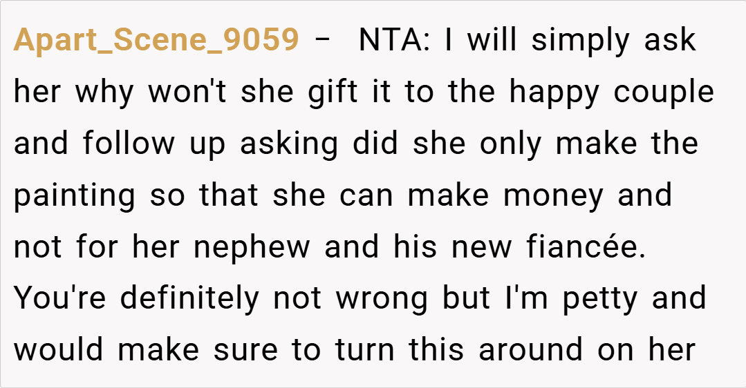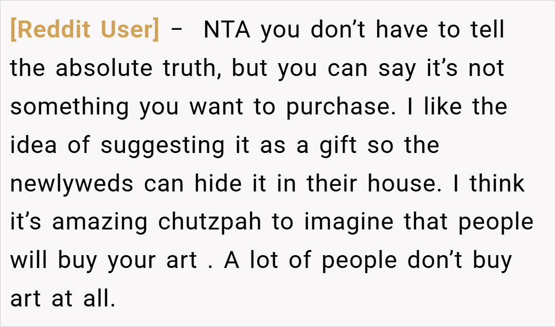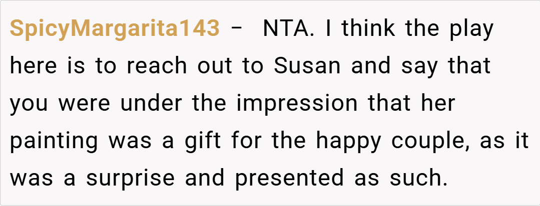 “It’s common for step-relatives and in-laws to feel pressured to conform to a collective family image, but individuality is equally important. When an artwork doesn’t resonate with the buyer, forcing it into the household can lead to ongoing tension and resentment.” In this case, the mom’s refusal to buy the painting isn’t a rejection of Susanne’s passion or talent; it’s an assertion of her right to curate her own space without being guilt-tripped into a purchase she finds disagreeable.