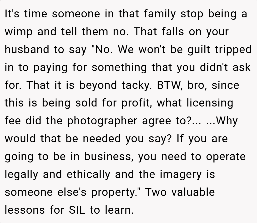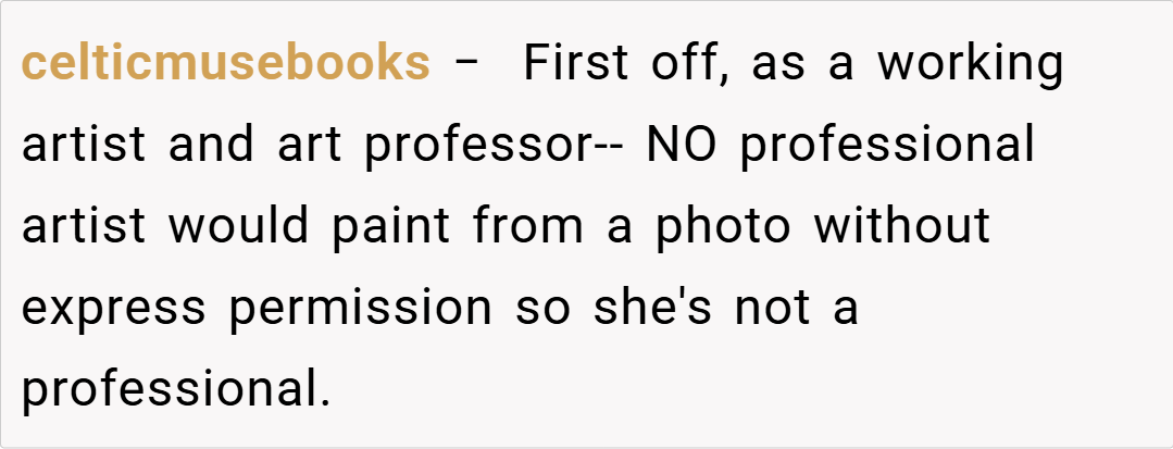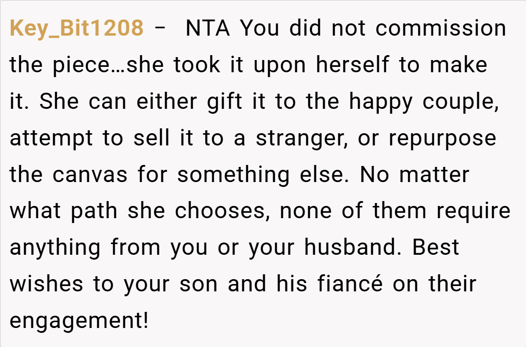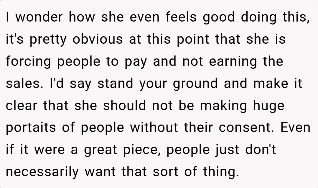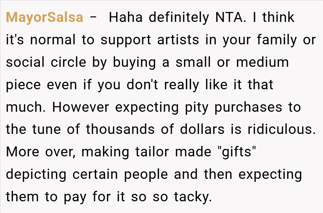 Redditors overwhelmingly support her stance. Many emphasize that being forced to purchase a piece of art—especially one that feels tacky and uninvited—crosses a line. Commenters note that if the family wants a collective memory in art form, they should commission it together rather than imposing it on someone who clearly doesn’t appreciate it.