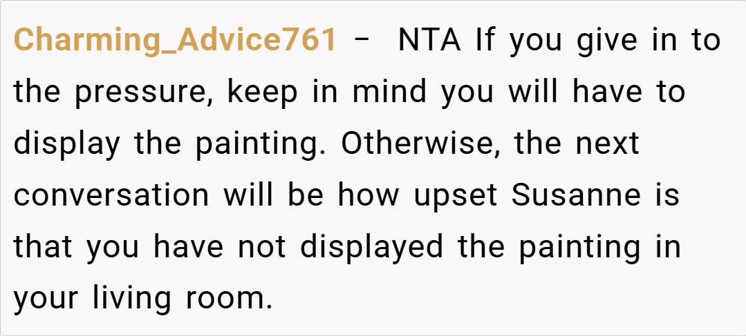 A recurring sentiment is that buying such a painting would only open the floodgates to more unsolicited “gifts” in the future, making it a slippery slope of emotional blackmail. The consensus among users is that personal taste should never be overridden by family pressure, and that if Susanne truly wants her art celebrated, she should create something that resonates with everyone rather than relying on guilt as a sales tactic.