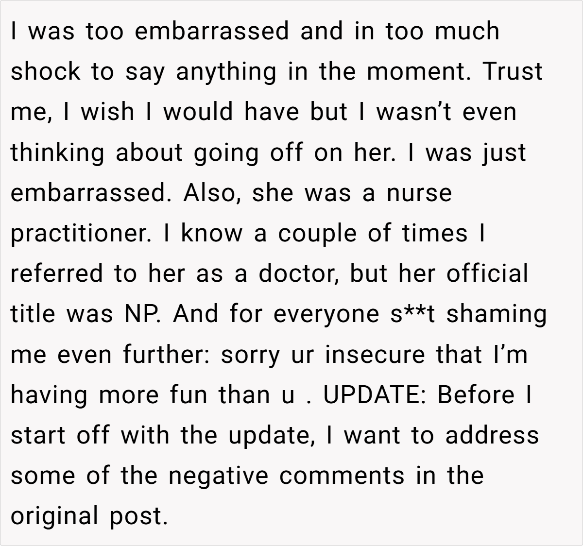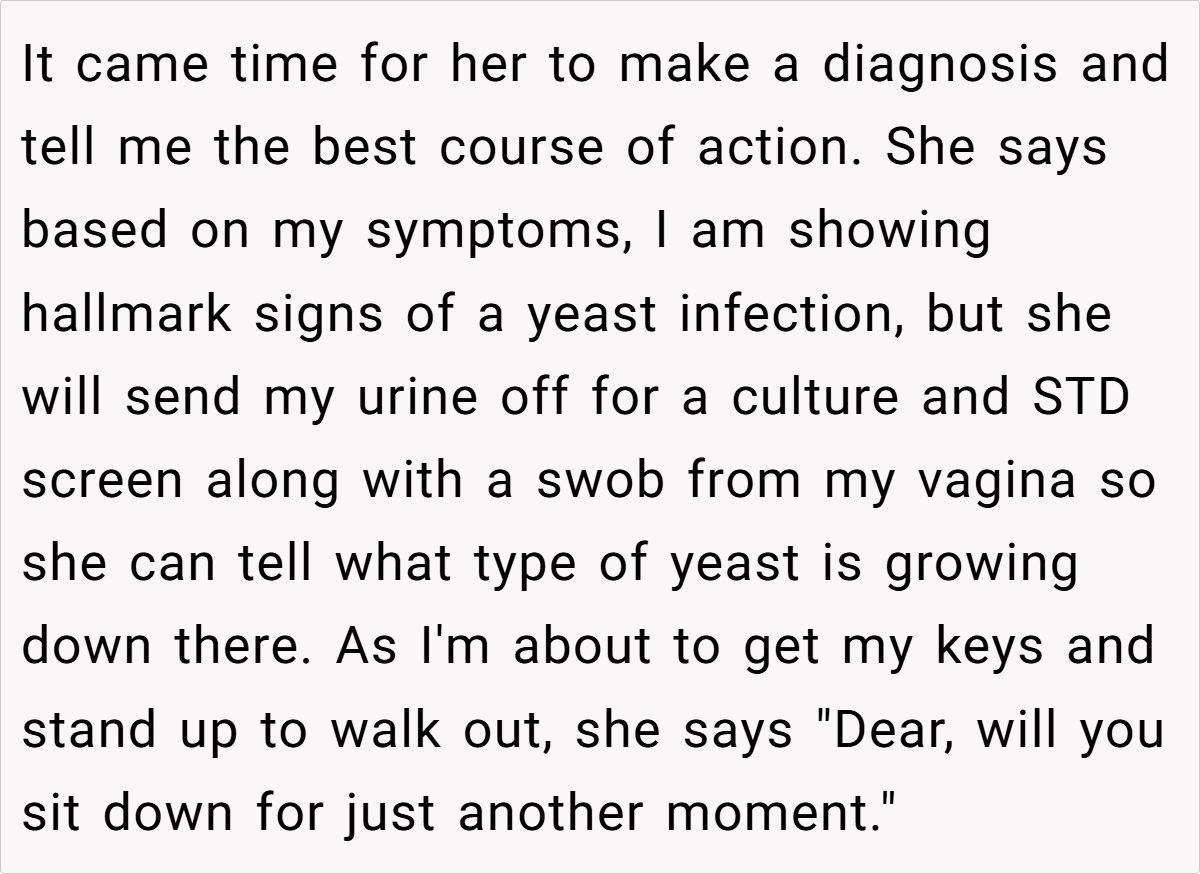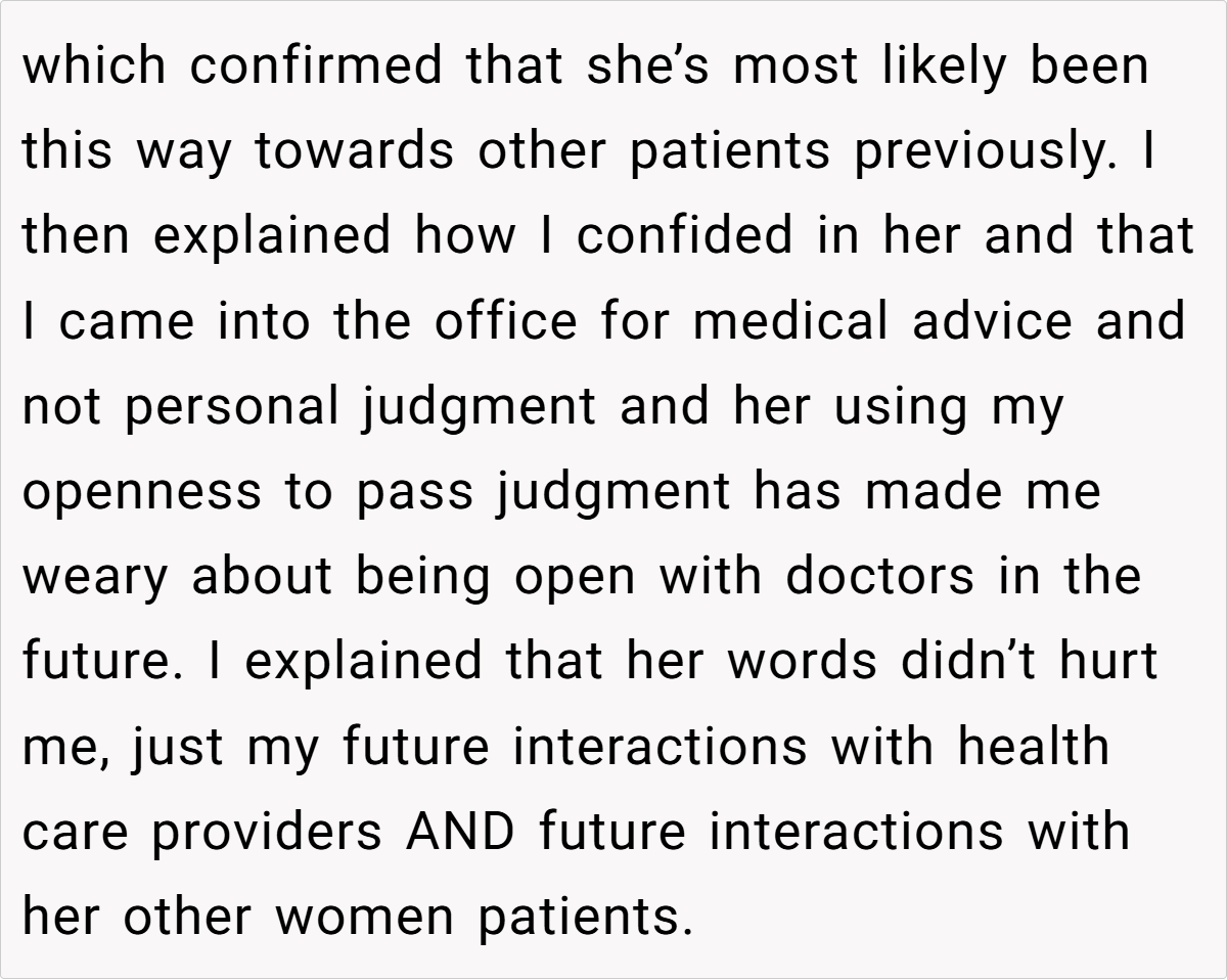 In conclusion, while addressing health concerns should be free of personal judgment, experiences like these remind us that boundaries in healthcare can sometimes be blurred. Reporting such incidents isn’t about punishing providers—it’s about ensuring that future patients receive the respectful, evidence-based care they deserve.