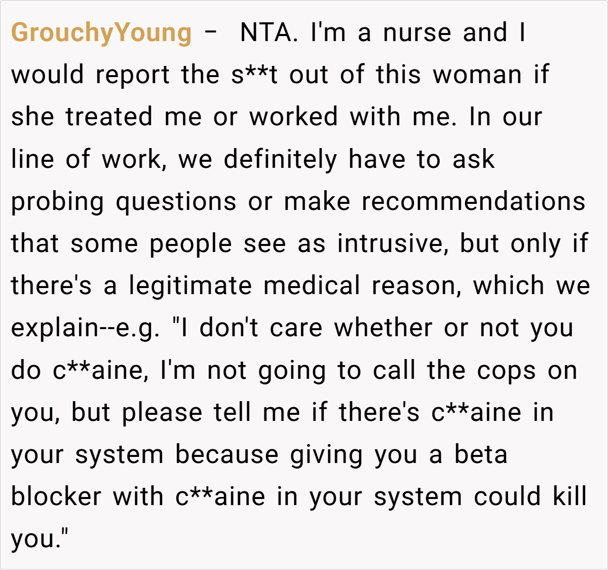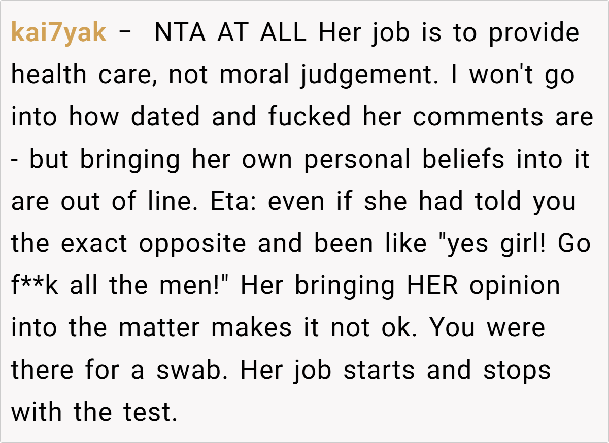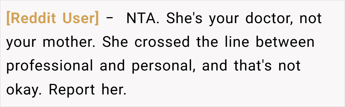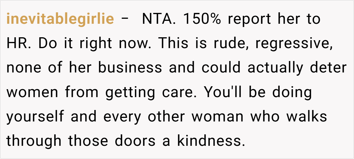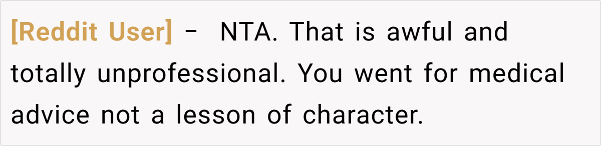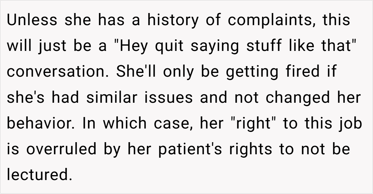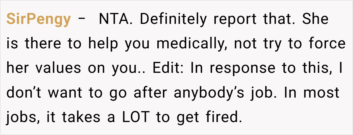 Redditors overwhelmingly support the decision to report such behavior. Many argue that healthcare should never become a forum for moral judgment, emphasizing that every patient deserves to be treated without bias or unsolicited commentary. The community’s consensus is clear: shaming patients for personal choices undermines professional ethics and can have lasting negative impacts.