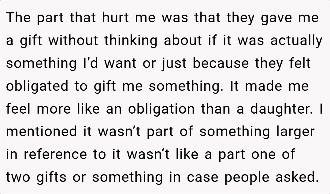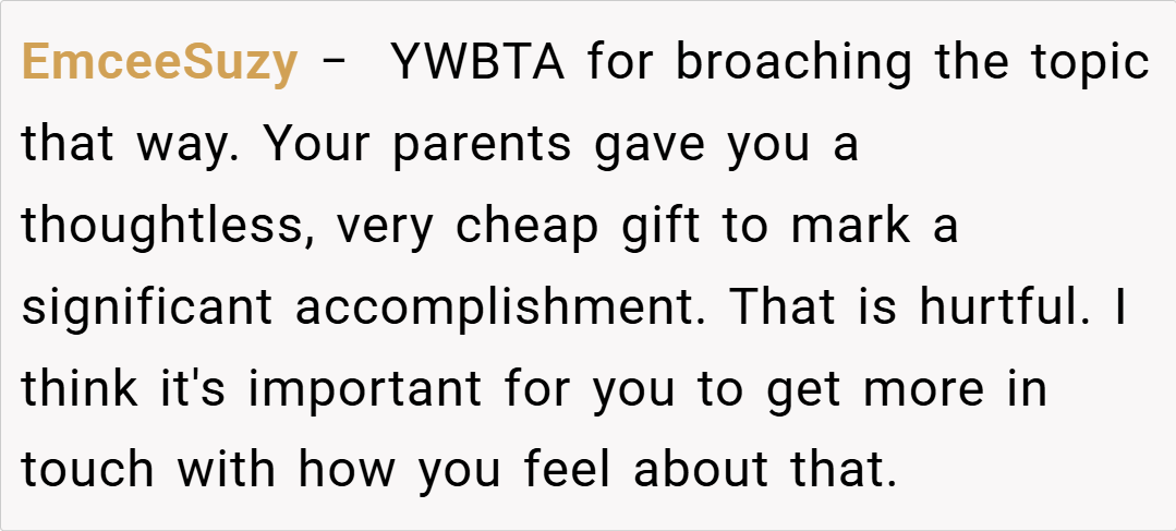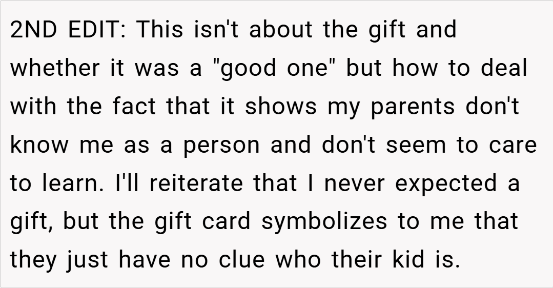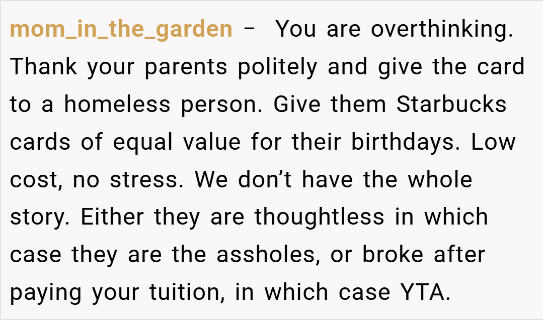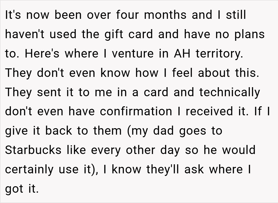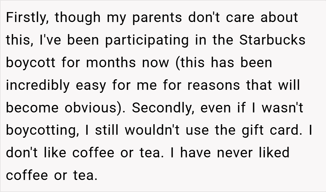 Though she never expected an extravagant present (especially since her parents covered tuition while she handled rent and groceries), this token gift cut deep. Not only does she not like coffee or tea, but she’s also been actively boycotting Starbucks for months. Instead of feeling celebrated, the gift made her question whether her parents truly know or care about who she is.