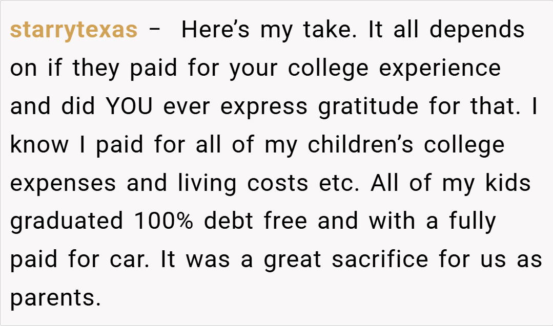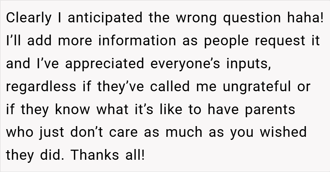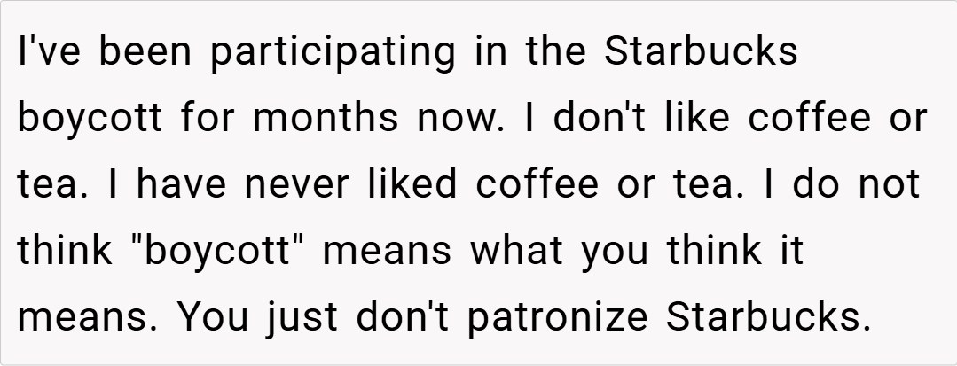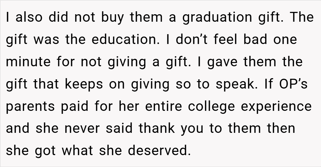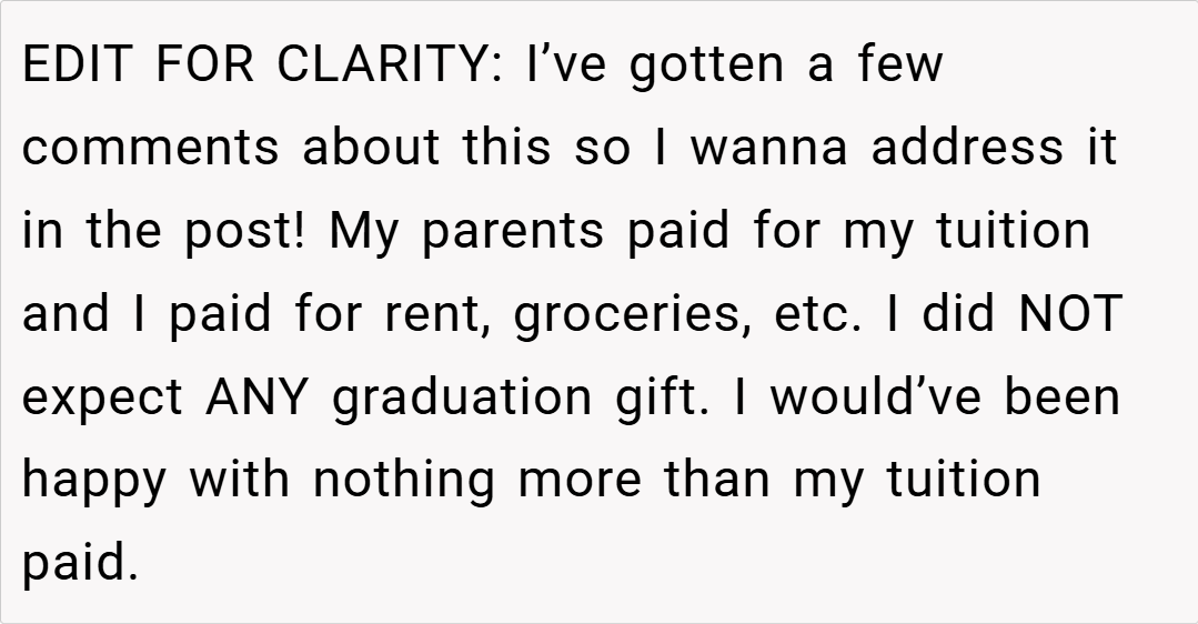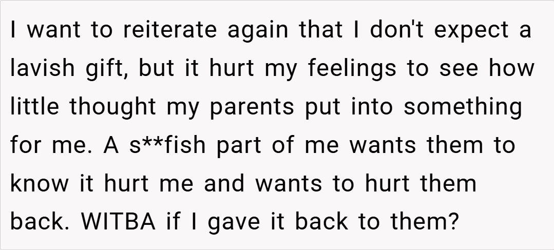 Though she never expected an extravagant present (especially since her parents covered tuition while she handled rent and groceries), this token gift cut deep. Not only does she not like coffee or tea, but she’s also been actively boycotting Starbucks for months. Instead of feeling celebrated, the gift made her question whether her parents truly know or care about who she is.