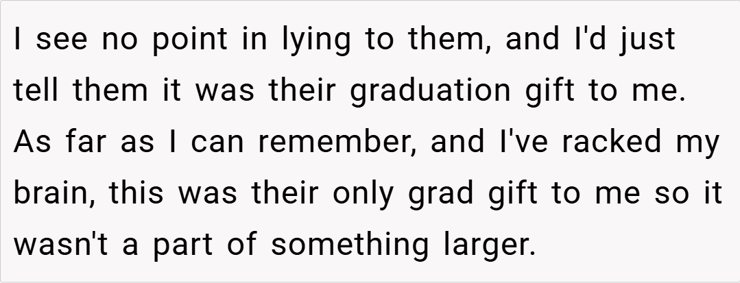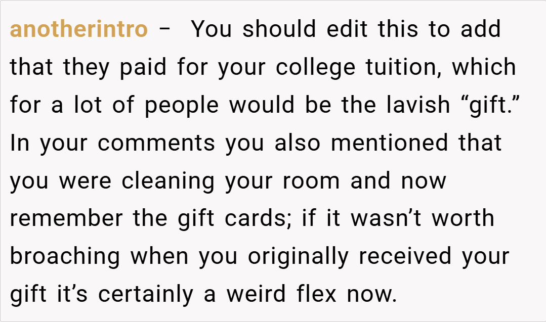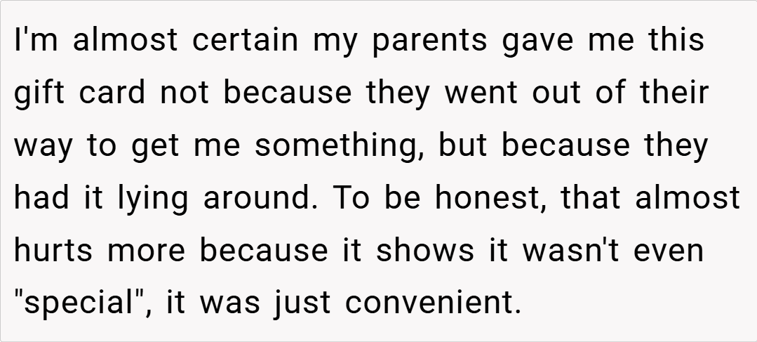 Now, four months later, she’s seriously considering returning the gift card. The thought is that it symbolizes thoughtlessness and detachment—a reminder that her parents simply picked something up out of convenience rather than out of genuine understanding of her tastes. This brings us to the question: AITA for returning my parents’ graduation gift to them?