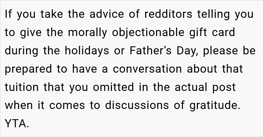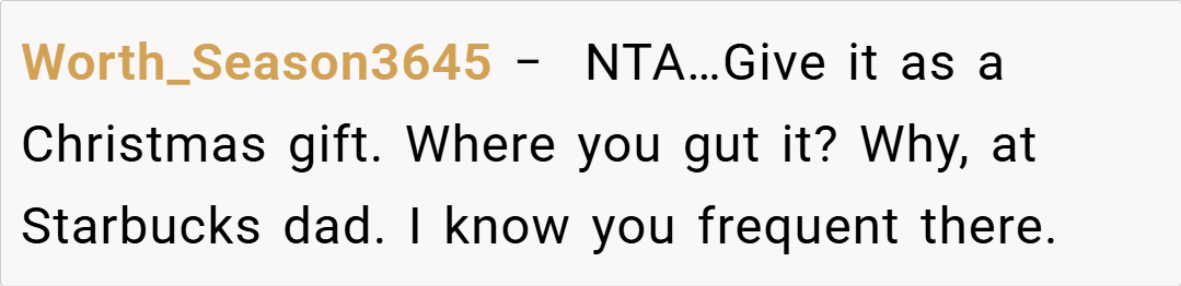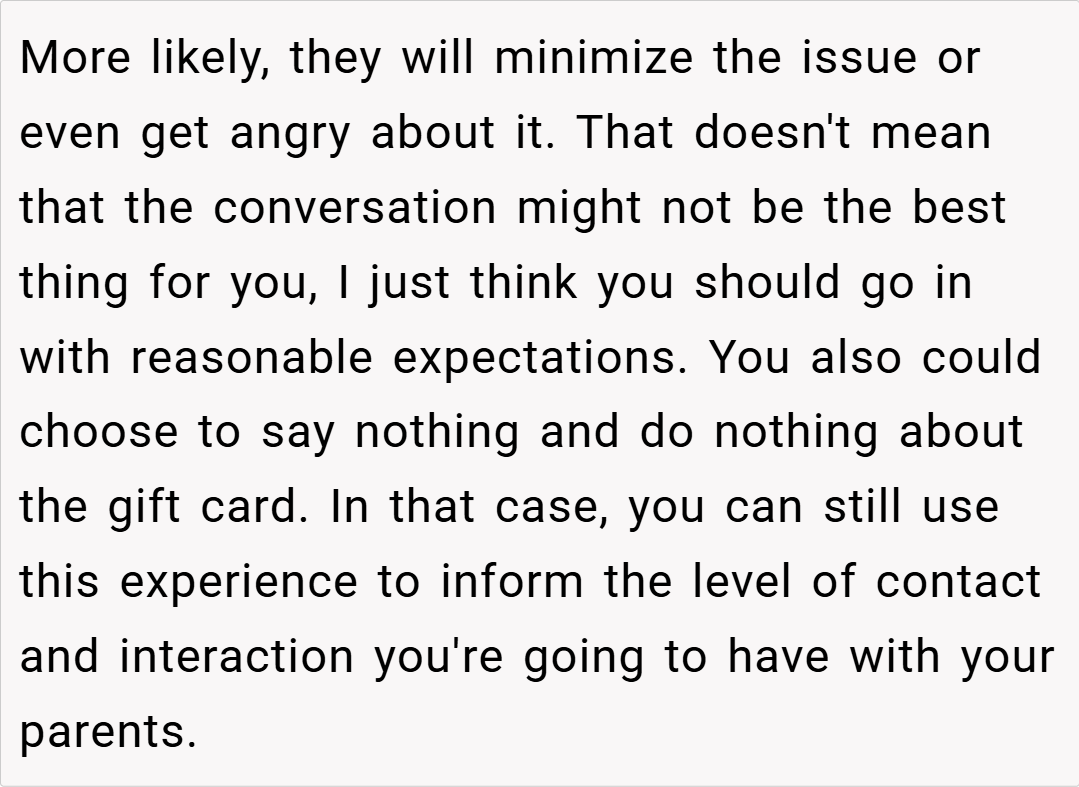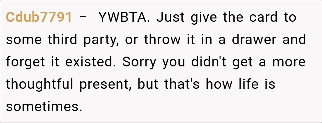 Several redditors expressed support for her decision. One user commented, “If your parents have never taken the time to understand that you don’t like coffee, then returning that gift card is a valid way to say, ‘I deserve something that reflects who I am.’ It’s not about the money—it’s about respect.”