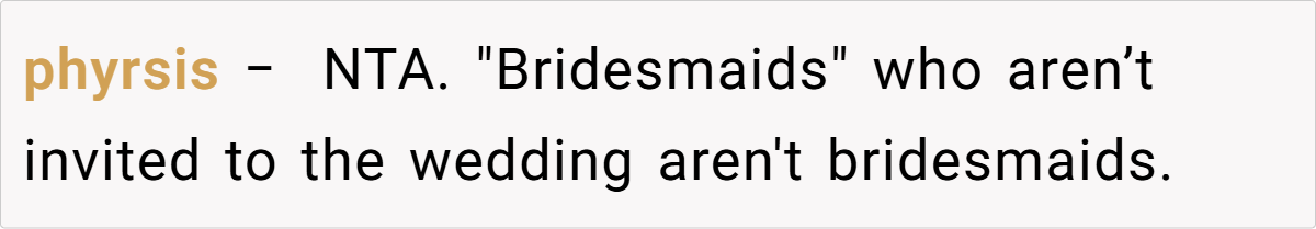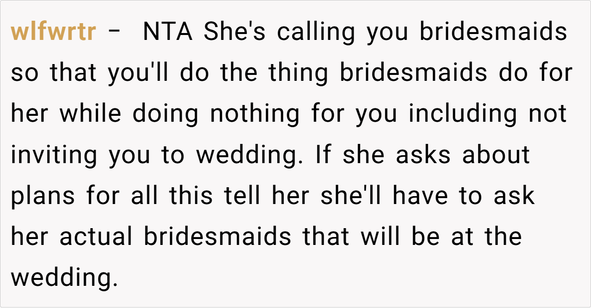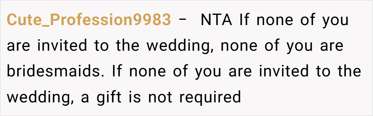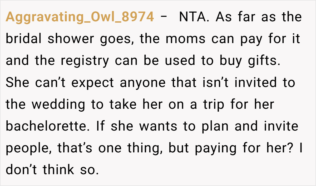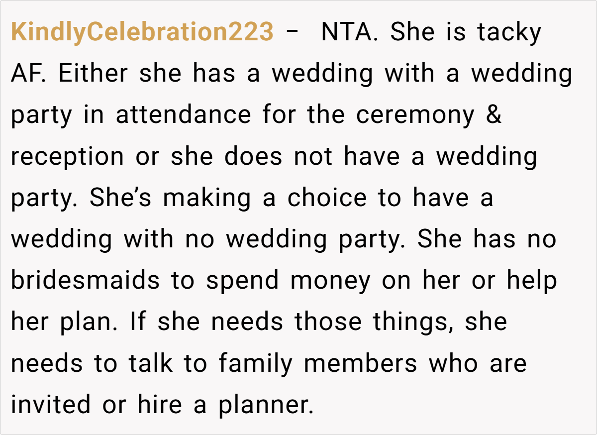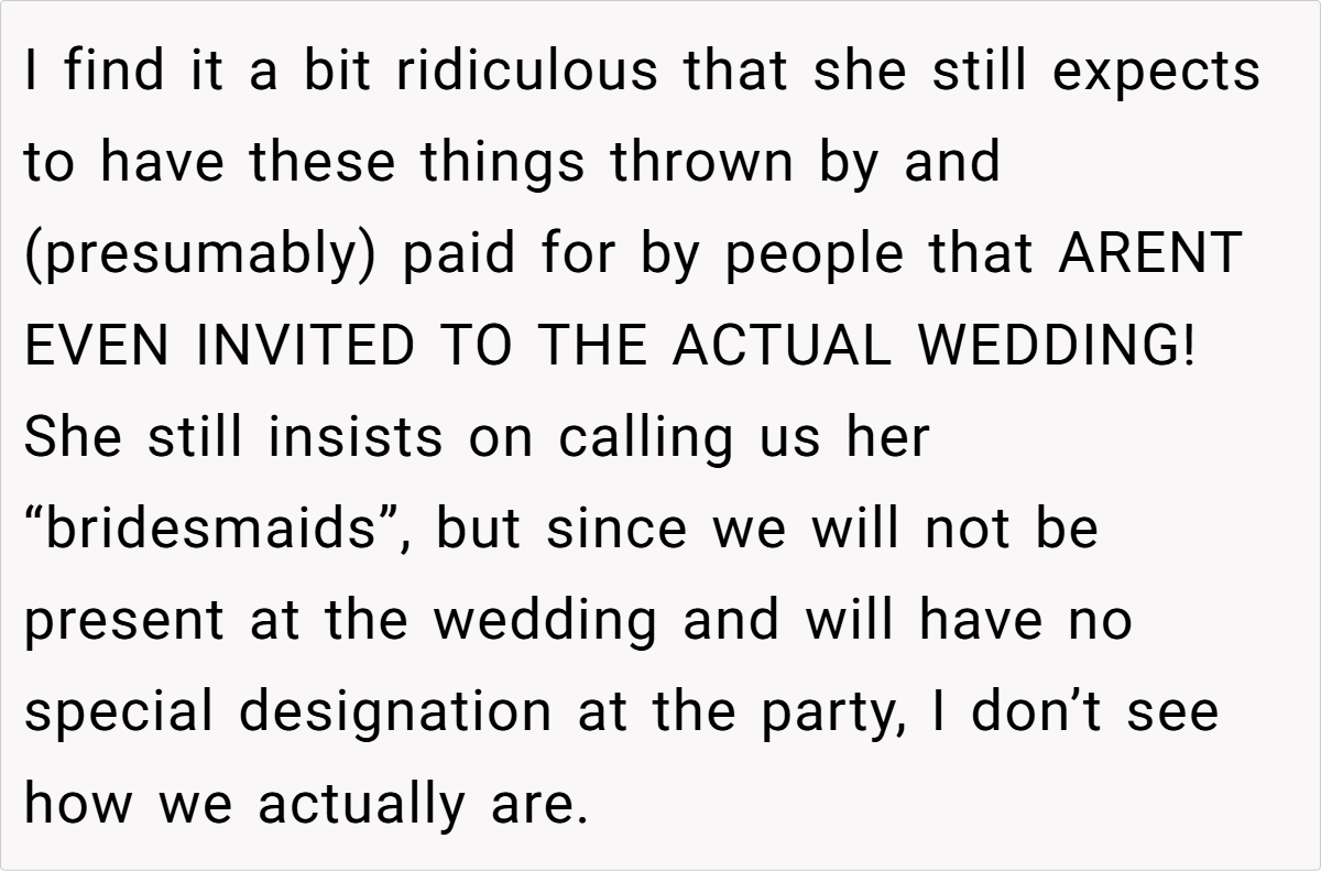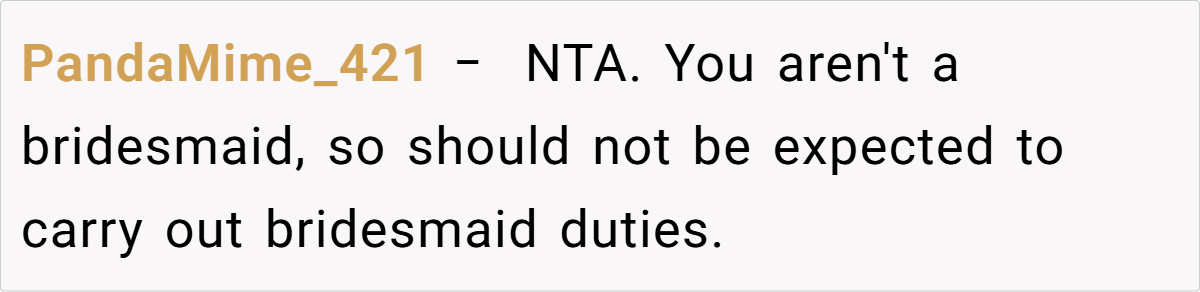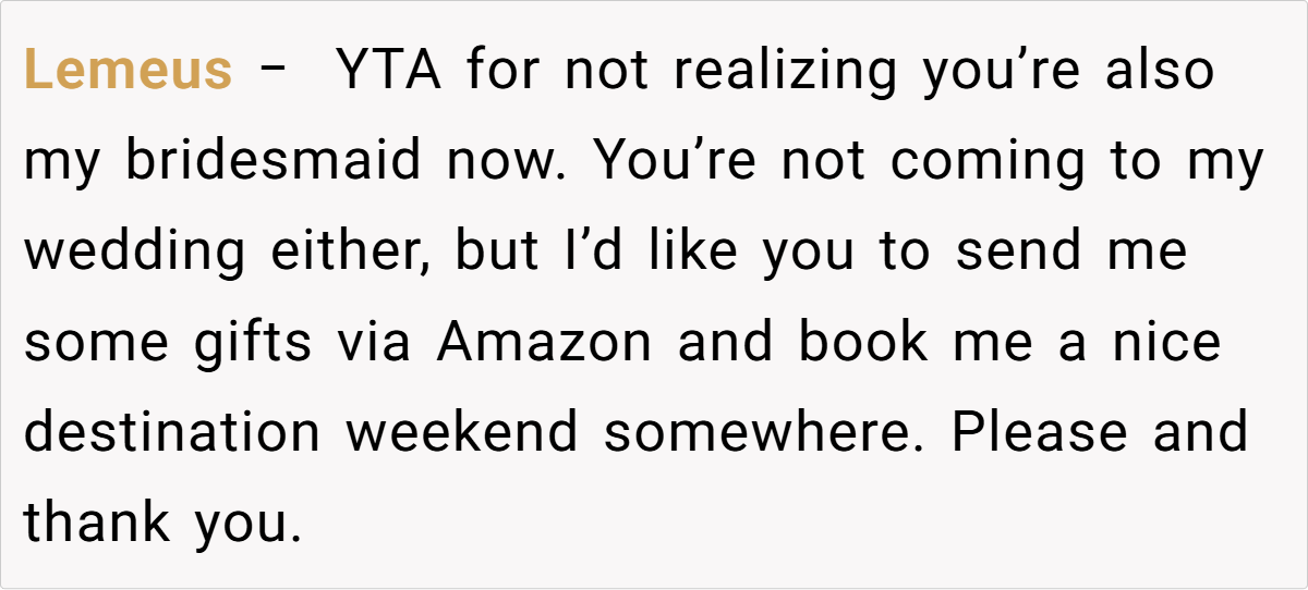 Here are some hot takes from the Reddit community—candid and humorous in their approach to wedding etiquette dilemmas. Some redditors argue that if you’re not invited to the wedding, you’re not obligated to perform any bridal party duties. Others point out that the disconnect between a private ceremony and extravagant pre-wedding events is simply illogical. The comments capture everything from blunt truths to playful sarcasm, highlighting that wedding traditions can sometimes be more complicated than they seem.