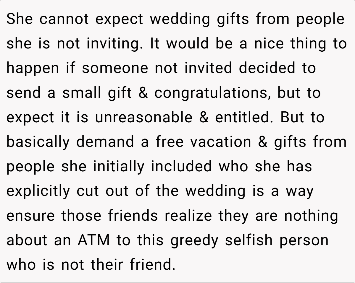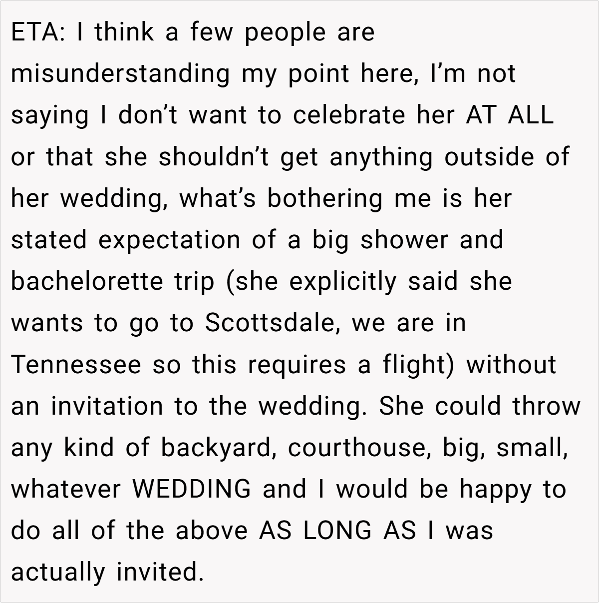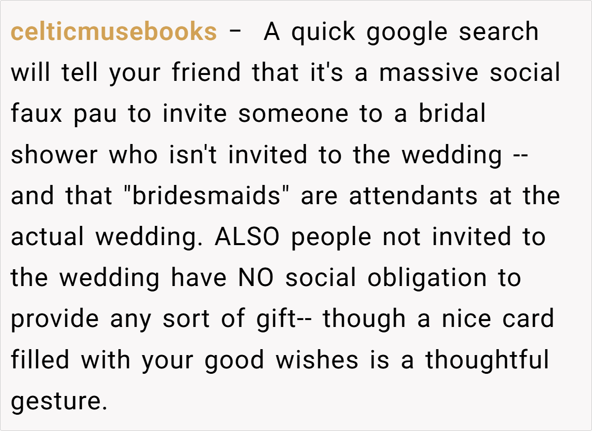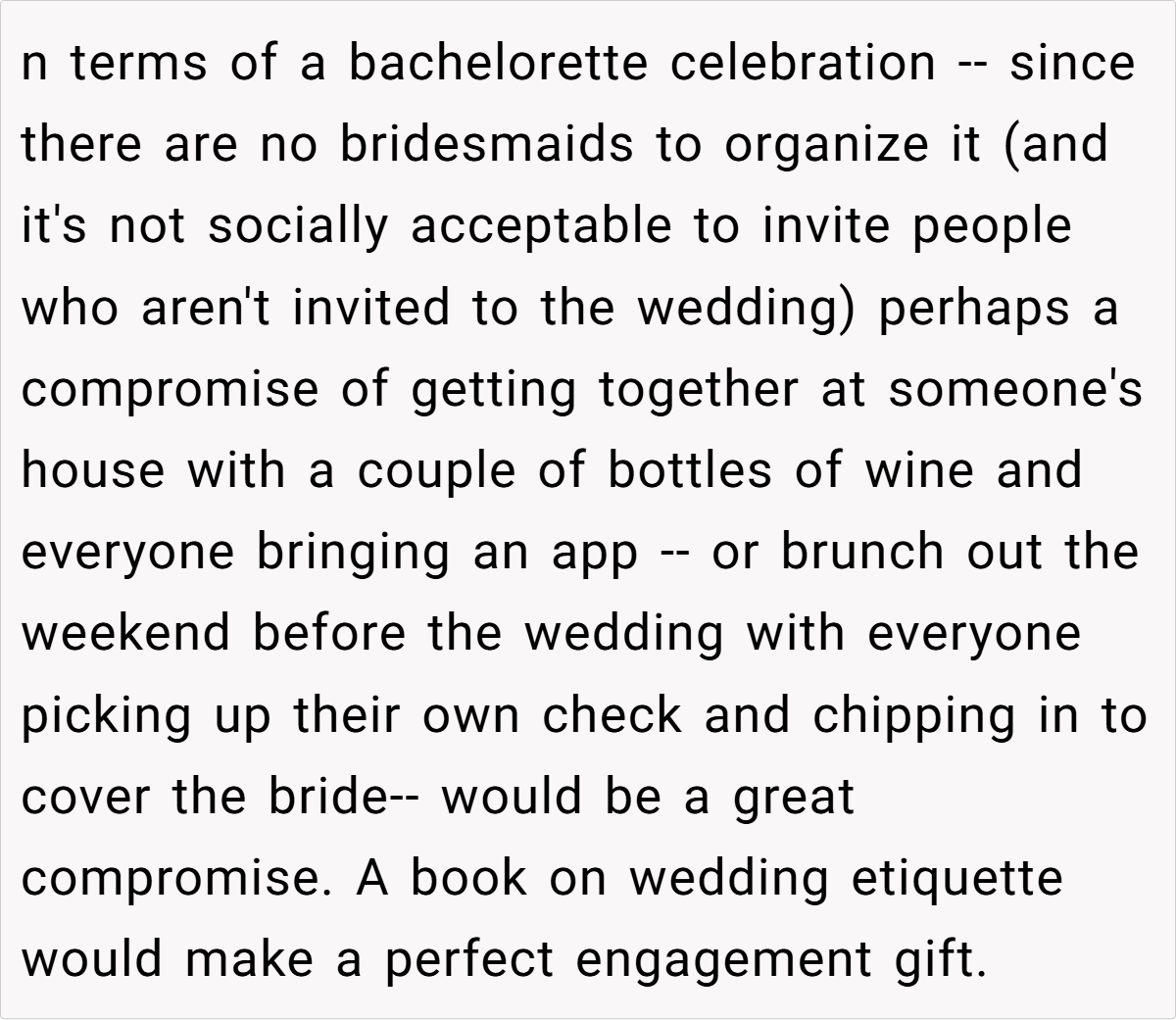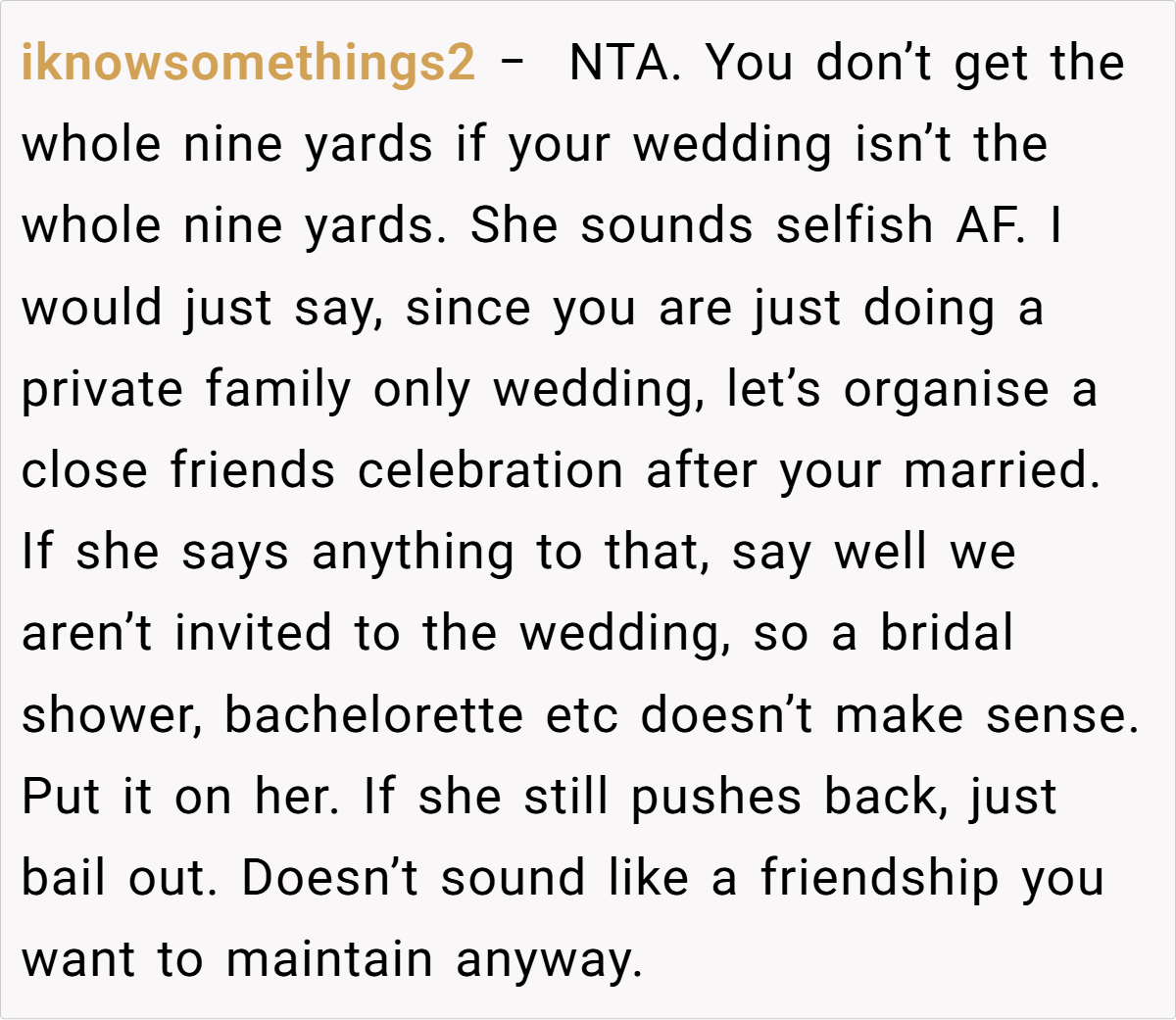 Here are some hot takes from the Reddit community—candid and humorous in their approach to wedding etiquette dilemmas. Some redditors argue that if you’re not invited to the wedding, you’re not obligated to perform any bridal party duties. Others point out that the disconnect between a private ceremony and extravagant pre-wedding events is simply illogical. The comments capture everything from blunt truths to playful sarcasm, highlighting that wedding traditions can sometimes be more complicated than they seem.
