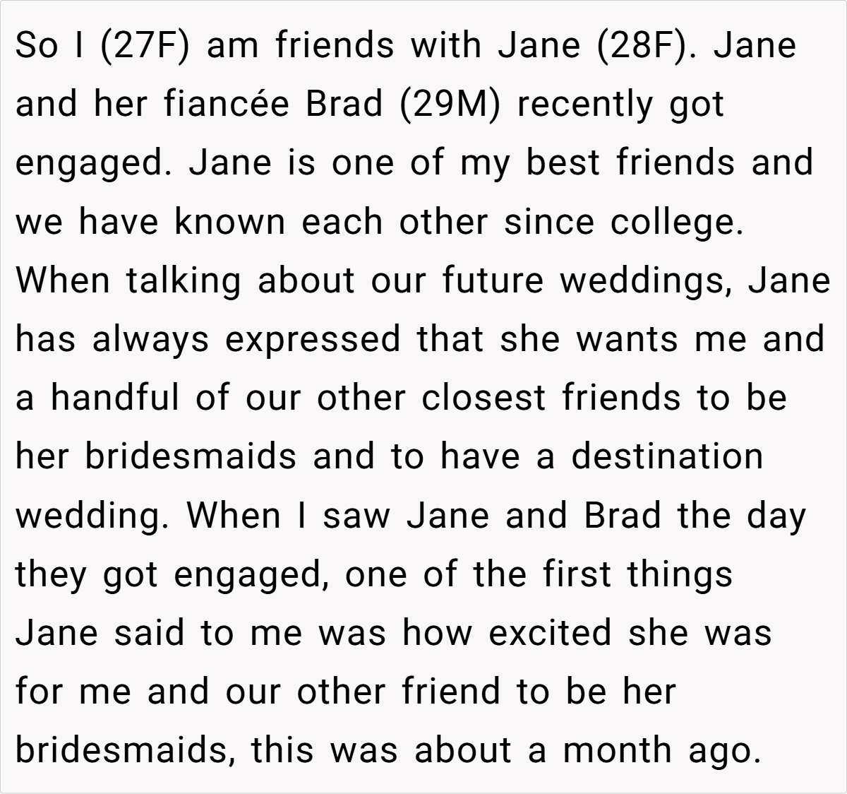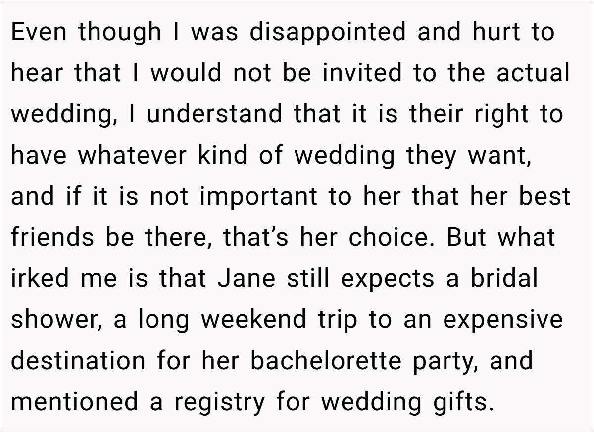 ‘WIBTA if I tell my friend her “bridesmaids” won’t be throwing her an extensive bachelorette party if we aren’t invited to the wedding?’