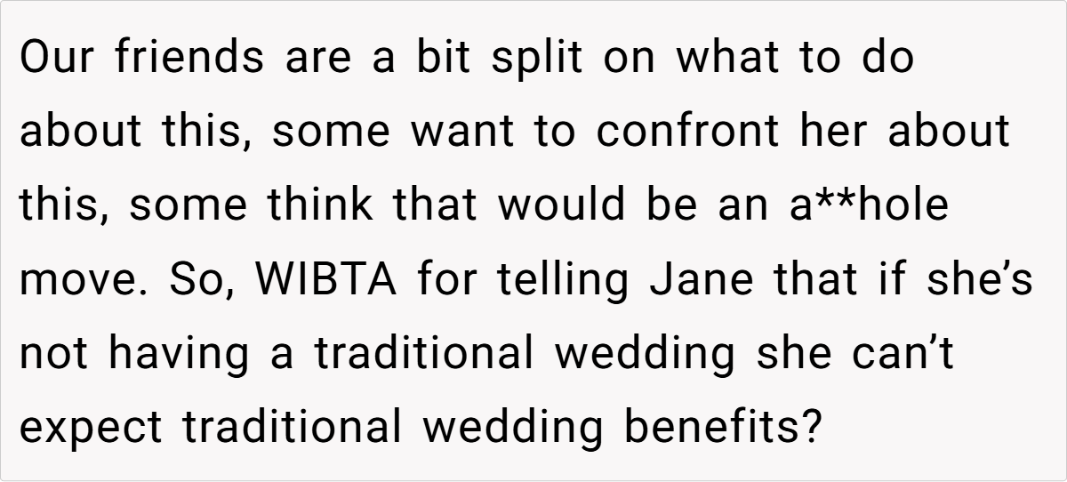 On one hand, our OP respects the couple’s right to choose, yet she can’t help but question the fairness of shouldering expensive traditions without the honor of attending the wedding. It’s a delicate balance between personal desire and social expectation.