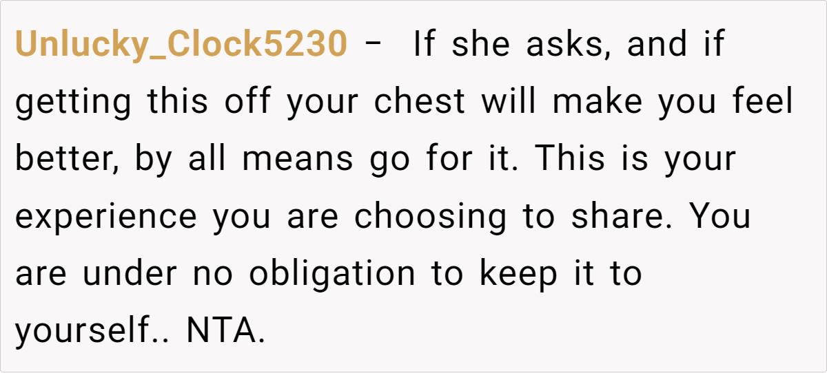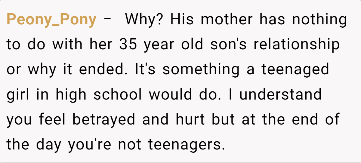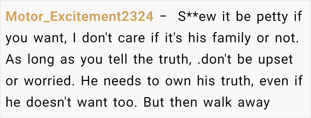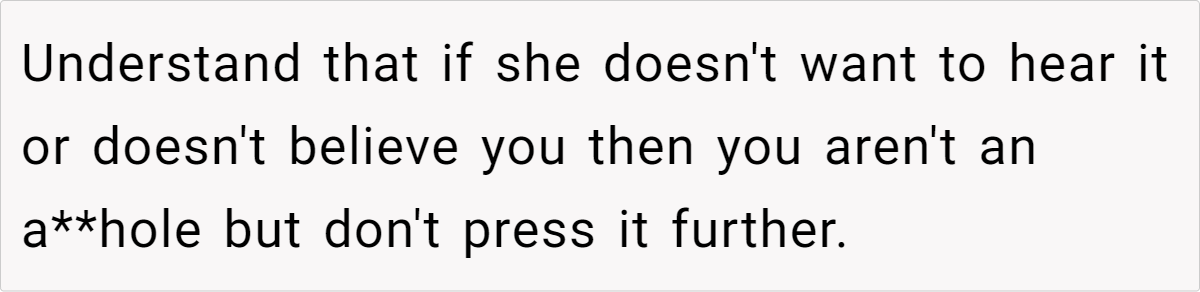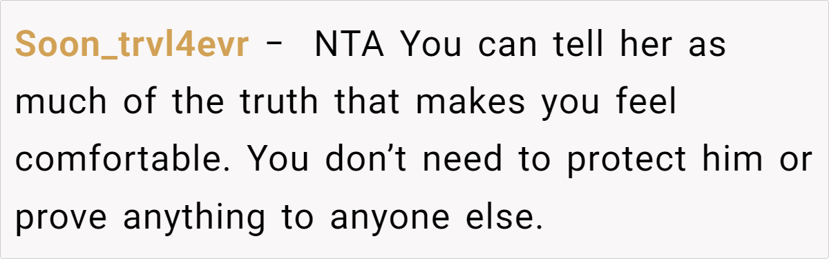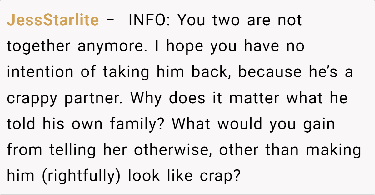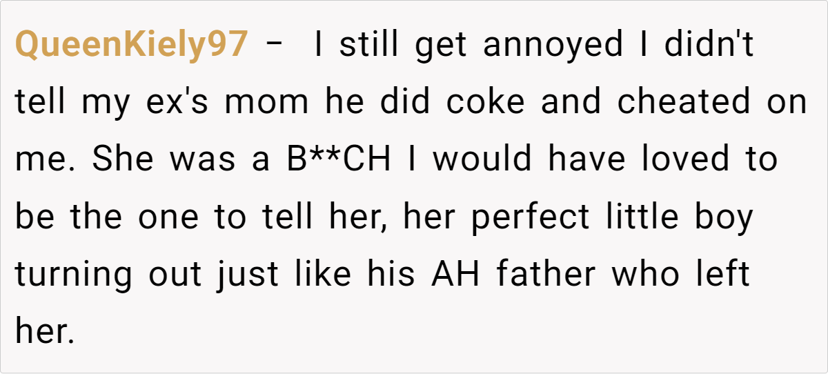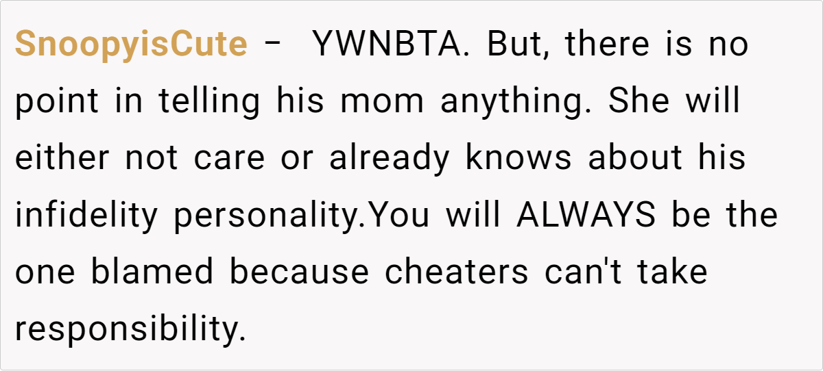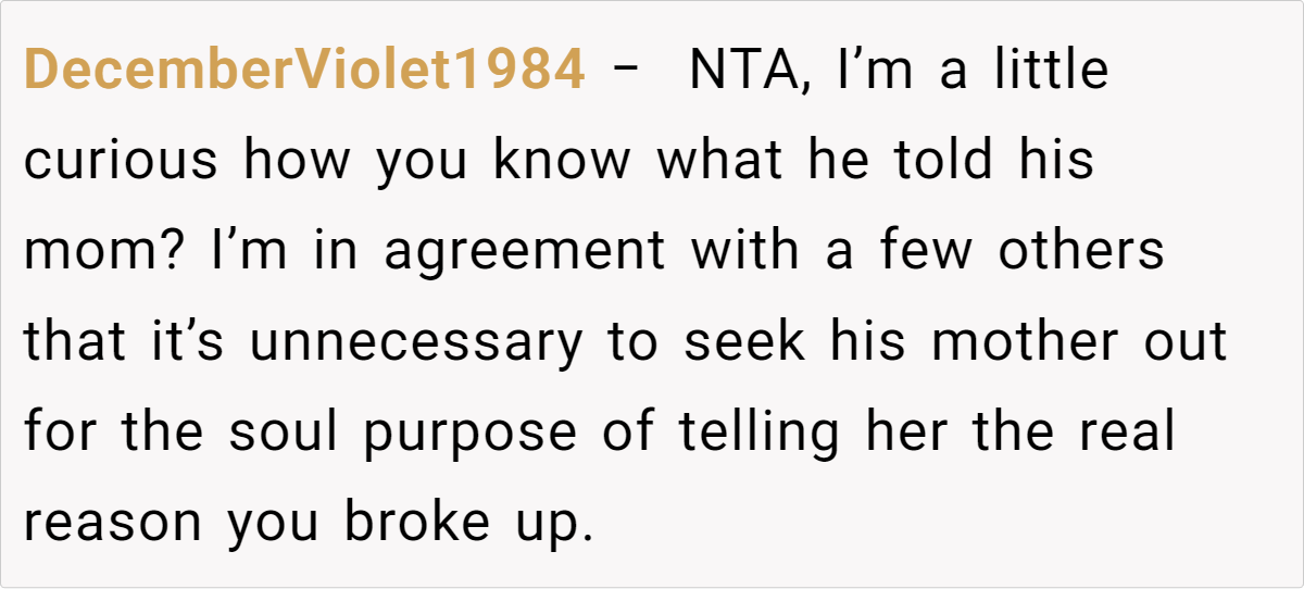 The Reddit community is divided on this dilemma. Many feel that since the relationship is over, you’re under no obligation to sugarcoat the truth—especially if doing so would validate your own experience and shed light on a partner’s betrayal. Others caution that involving an ex’s mom in what should be a private matter might lead to unnecessary complications. Some comments even point out that if you do decide to speak up, you should keep it brief and factual, leaving out details that might only serve to fuel further resentment.