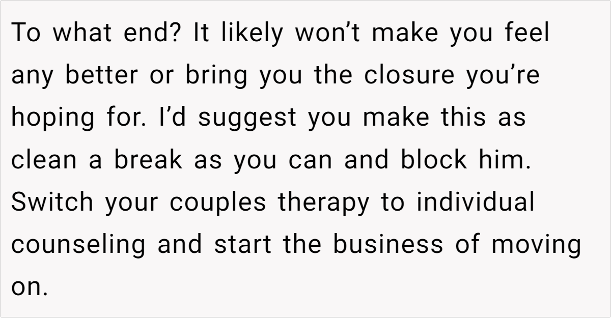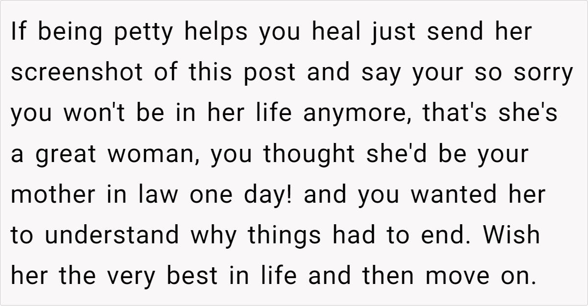 In this case, OP’s desire to tell her ex’s mother the truth about their breakup is understandable, given his attempts to shift the blame and avoid accountability. However, Dr. Firestone suggests that “Focusing on exposing someone else’s behavior or seeking validation from their family members can be a distraction from the important work of healing and moving on. It’s more beneficial to focus on self-care, setting boundaries, and creating a healthy foundation for future relationships.”