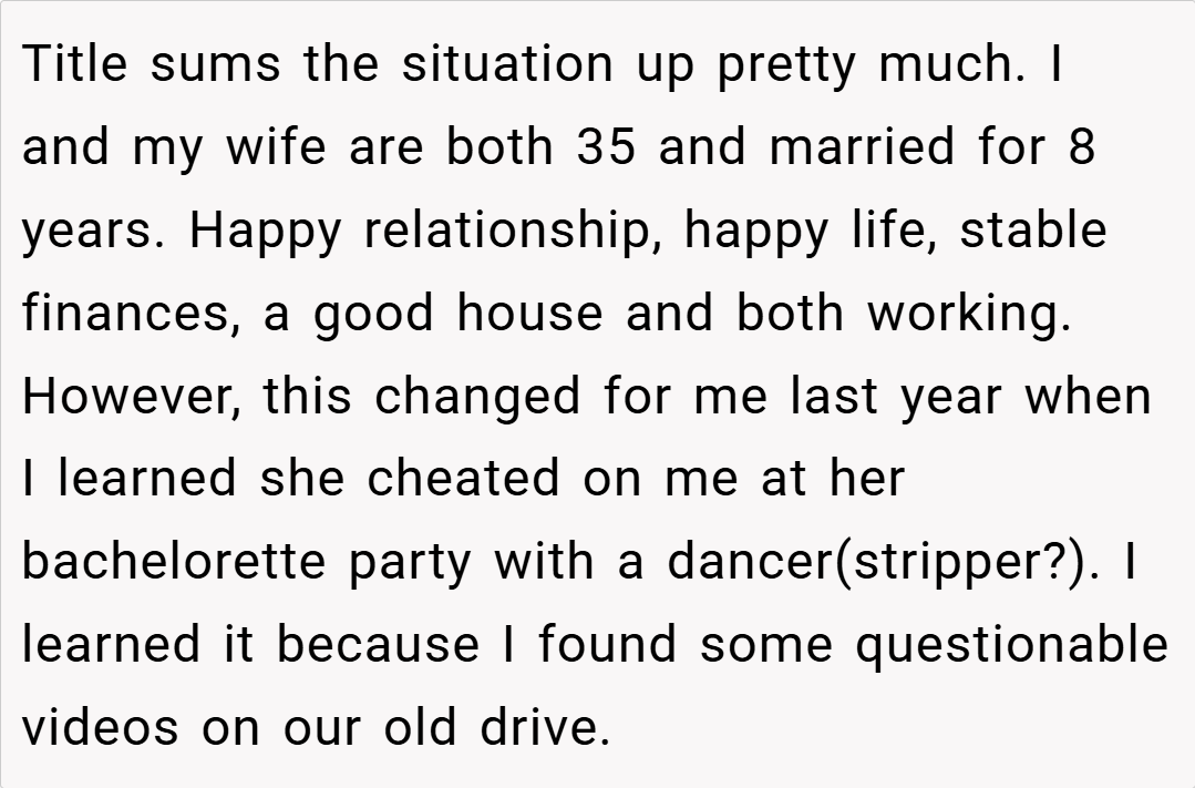 When trust is shattered, even the happiest of relationships can take a dramatic turn. In this post, a 35‑year‑old man shares how his eight‑year marriage—once marked by stability, love, and shared dreams—was irreversibly changed after discovering his wife cheated on him at her bachelorette party. Despite a seemingly happy life together and the couple’s plans to start a family, the incident left him with a broken trust he feels he can never rebuild.