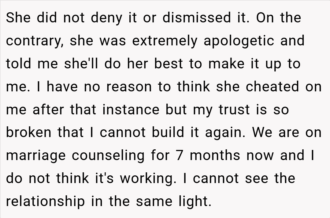 In summary, the OP is grappling with a deeply personal dilemma. After eight years of marriage, the discovery of infidelity at a significant event has irreparably damaged his trust, leading him to consider divorce. While his wife has apologized and seems committed to making amends, he simply cannot see a future where the betrayal doesn’t linger. The community is divided: some believe that forgiveness is possible, while others think that if trust is lost, divorce is a legitimate option.
