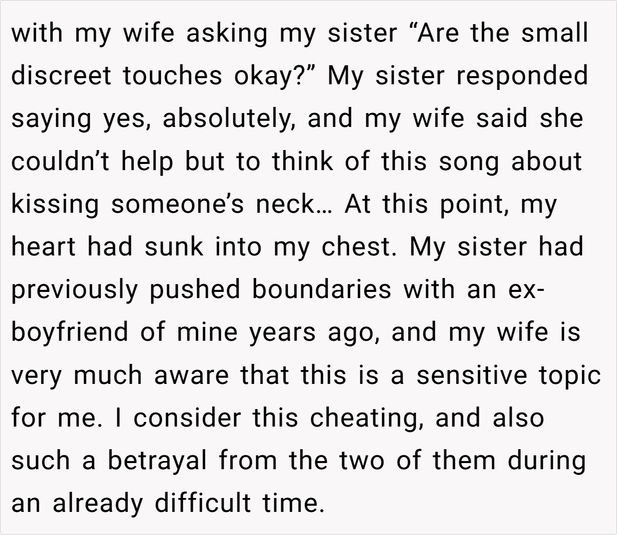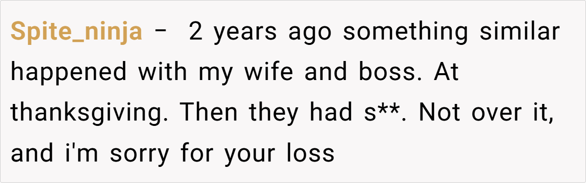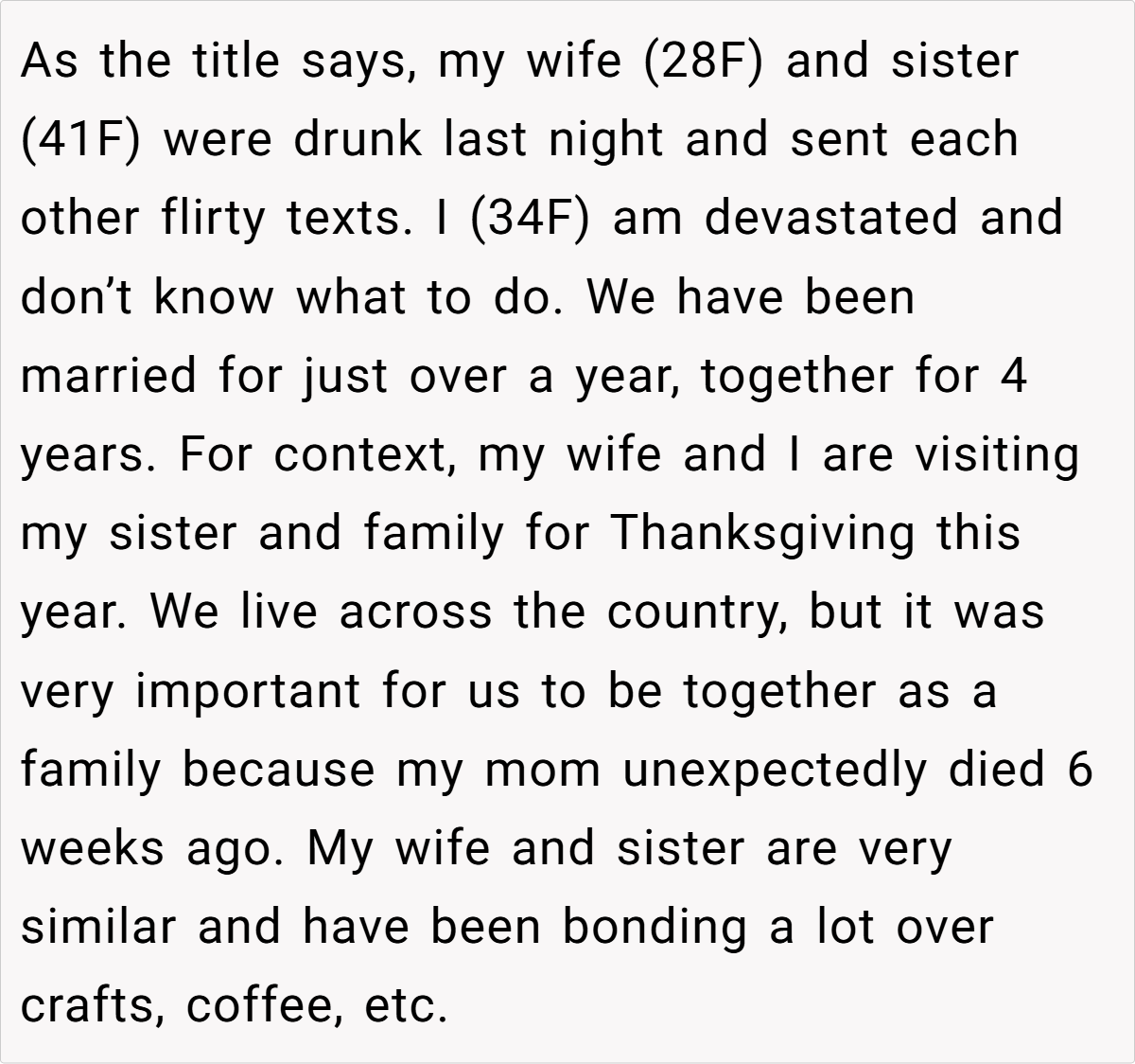 A Reddit user’s post lays bare this intersection. After losing her mother six weeks prior, she discovered her wife and sister exchanged flirtatious texts during a drunken Thanksgiving visit. The messages, which referenced “discreet touches” and s**ualized lyrics, surfaced amid the user’s grief and her wife’s emotional withdrawal.