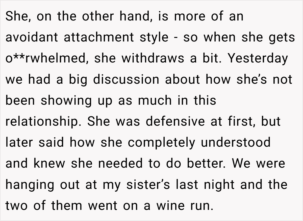 - Family boundaries: Temporary no-contact with the sister to rebuild marital trust.