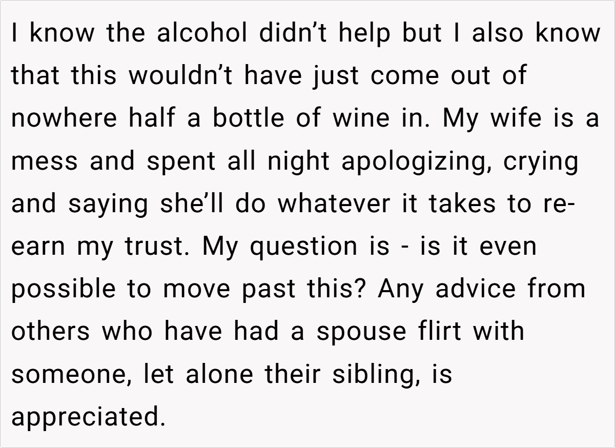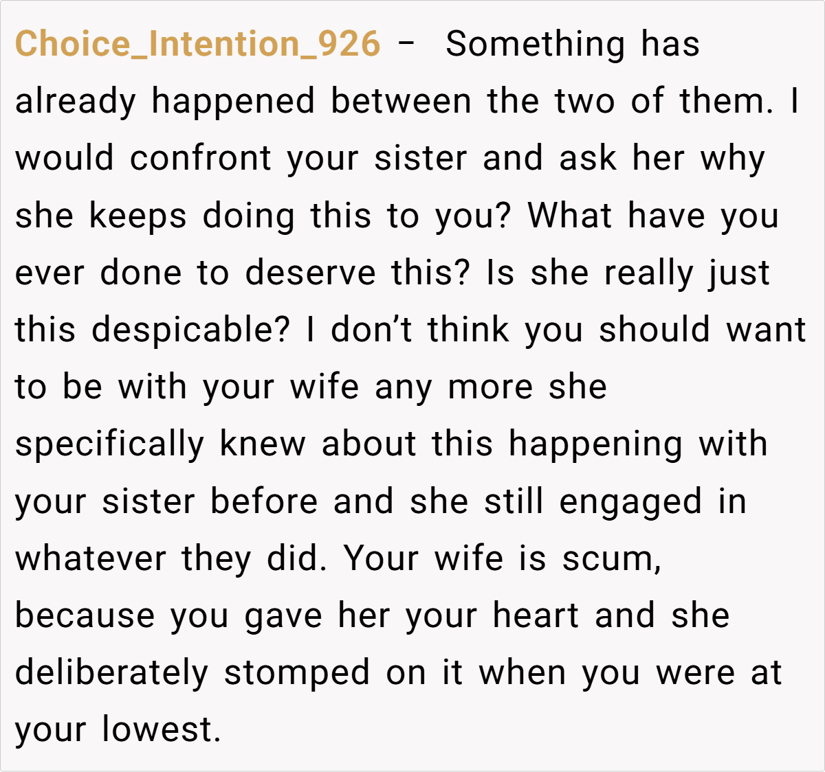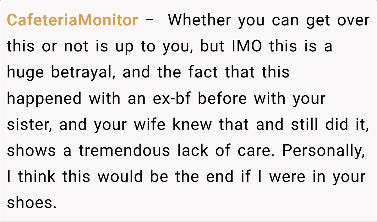 Compounding the pain is the sister’s history of crossing boundaries with the user’s past partner. Now, the user grapples with whether to salvage her marriage or walk away, questioning if trust can be rebuilt when betrayal involves both a spouse and a sibling.