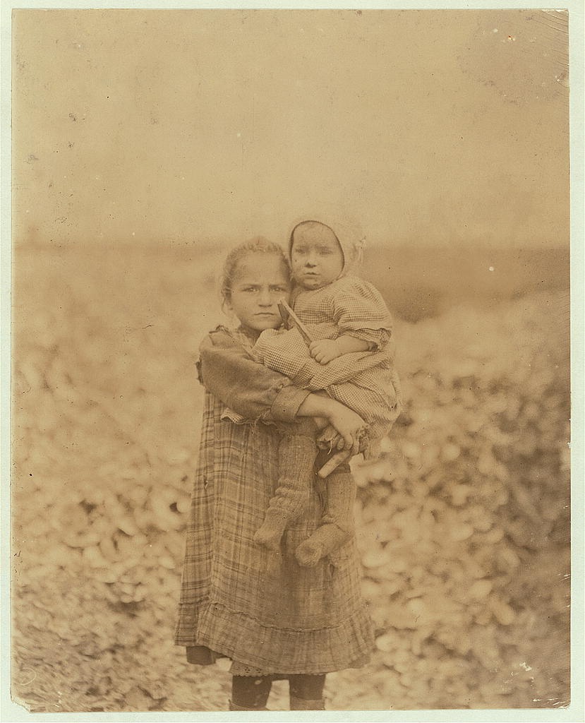 This photo shows three girls—Josie and Bertha, both six, and Sophie, ten—engaged in the tough work of shucking oysters. They worked at the Maggioni Canning Co., where child labor was common.